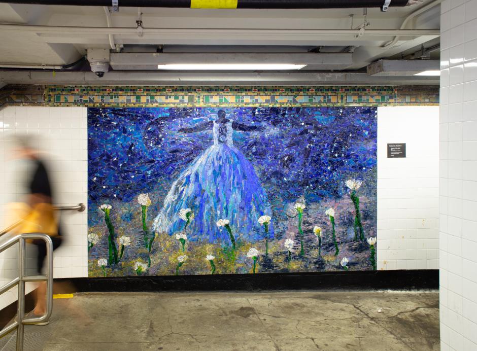 In the First Avenue north mezzanine, figures in lime green, aquamarine blue, and rosy pinks gather in a group (as riders do on subway platforms) and are depicted under the glow of a massive moon. Two characters from this assembly are also seen in the Avenue A northeast staircase. Caped heroes, a recurring image in Bradford’s body of work, guide riders in and out of the northwest and southeast stairs at Avenue A. In the First Avenue south mezzanine, riders are greeted by a dusky blue individual donning a gown in a field of flowers.