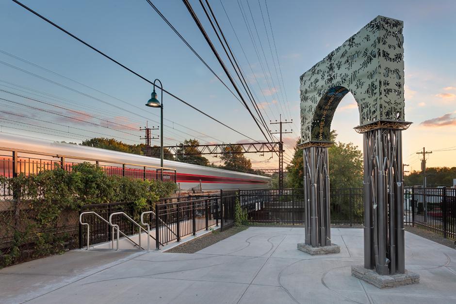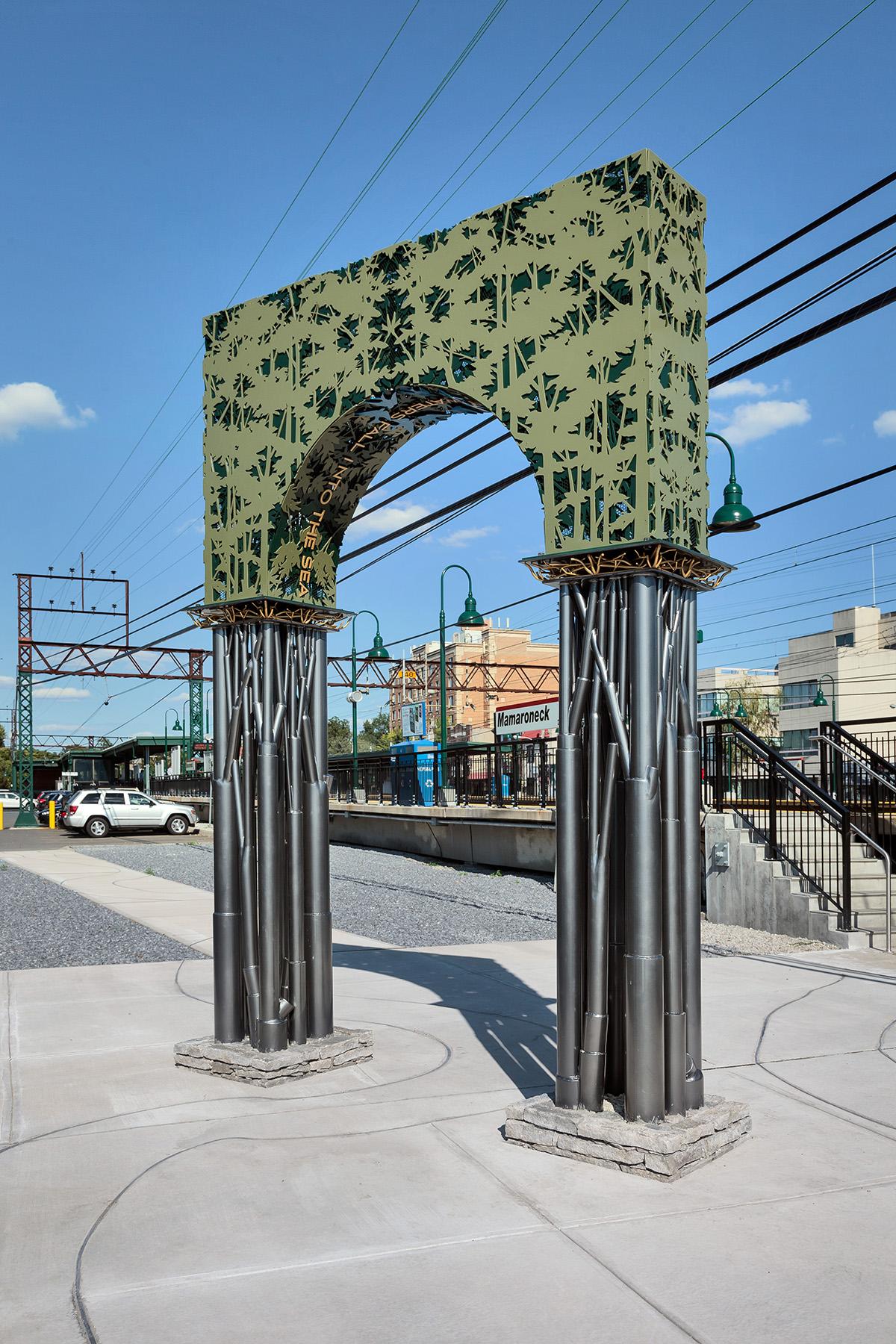 Where the Sweet Waters Fall is inspired by Romanesque Revival arches seen throughout the architecture of the village of Mamaroneck including its many arched bridges. The artwork title pays homage to the name of the village since it’s a partial translation of the Native American word Mamaroneck meaning, “Where the sweet waters fall into the sea.” With its slender trunks and foliated canopy of a grove of trees, the sculptural arch balances architectural form and narrative content, providing a new focal point and meeting place at a corner of the station that overlooks a busy roadway and a tree-filled park.