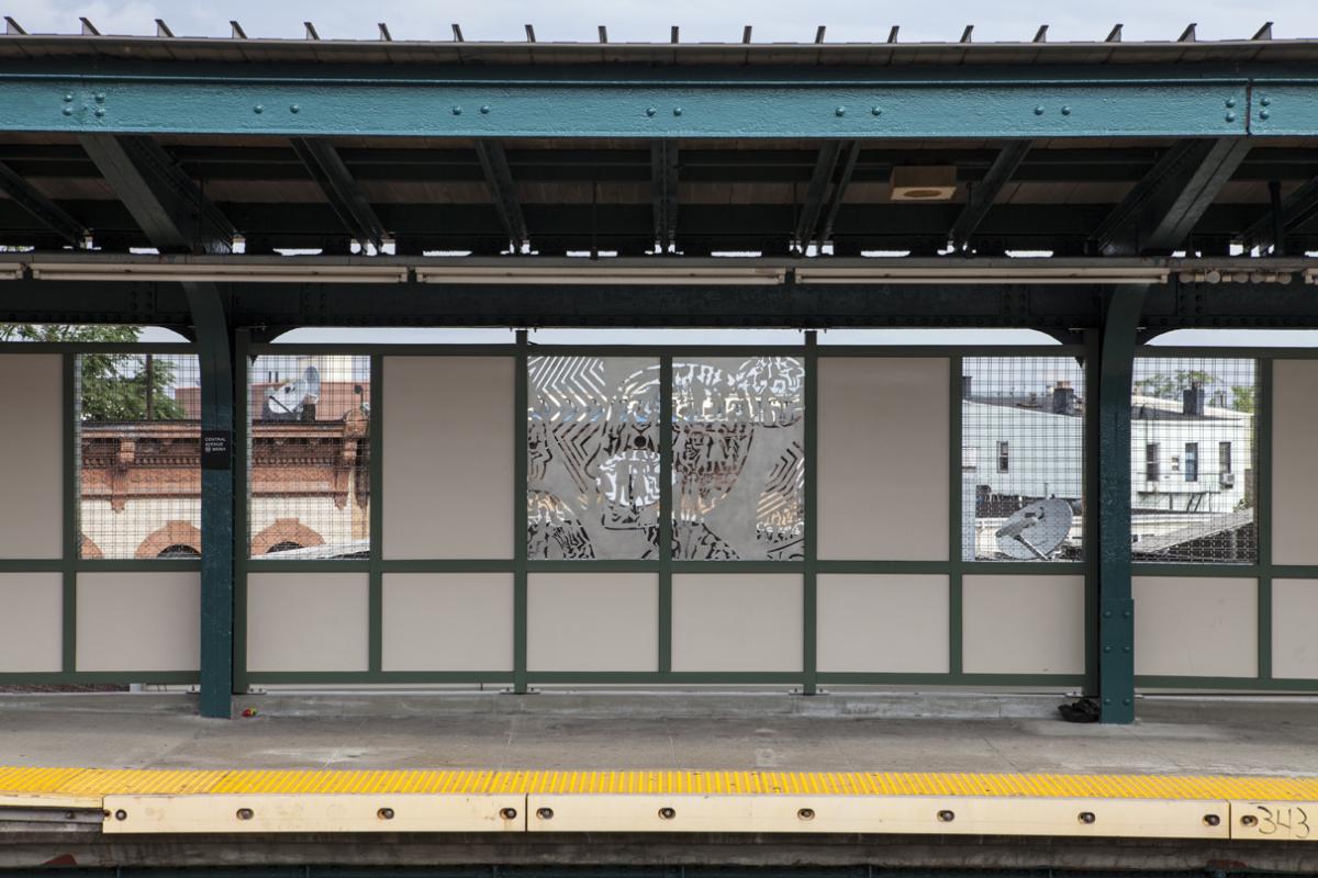 Bushwick residents come to life in George Bates’ "Generation Dynamica" at the Central Avenue station. Consisting of 20 stainless steel panels in the station’s platform windscreens, the work depicts larger characters encompassing smaller figures in silhouette, referencing the many populations who make the community their home. The scale of figures within figures causes the viewer’s the eye to keep moving across the panels, but what becomes quickly apparent is that all are connected.