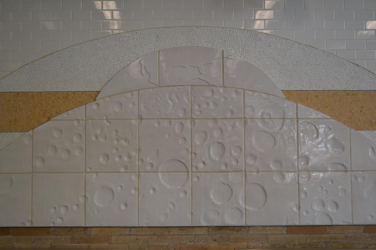 In creating the artwork for the Dyckman Street station, Wopo Holup found inspiration in nature. "Birds in Flight-Moon View" consists of ceramic tile reliefs of birds in flight that were originally installed in 1991 (and titled "Birds in Flight") within the white tile of the mezzanine wall and stairwells. With the opportunity presented when the station was rehabilitated, the artist was commissioned by MTA Arts & Design and created white ceramic, low relief tile of the moon and earth surrounded by a white mosaic banding. The new work provides an extraordinary modern view of the earth as seen from the moonscape (from the Apollo missions). Blending with the existing station tiles, the circular shapes of the composition compliment the arched windows of the historic station and expand the view from the earlier artwork, by continuing the sky view-further up and out.