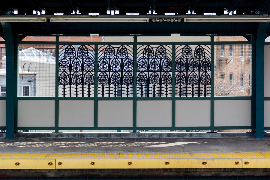 At the Knickerbocker Avenue subway station on the M line, artist Cal Lane created "The Digs," a series of steel sculptural panels that adorn the elevated station platforms with intricate lace-like pattern in the form of steel shovels. The shovels are arranged in a pattern that is reminiscent of architectural arch often seen in the station’s Bushwick neighborhood. Lane was drawn to the image of the shovel for its contrasting relationship between the functional shape of a utilitarian object and the elegance of a classic arch. Each of the 28 panels was hand carved by Lane with intricate detail that merged two specific architectural ornaments found on surrounding buildings to create a new pattern, one that evokes both the past and the present.
