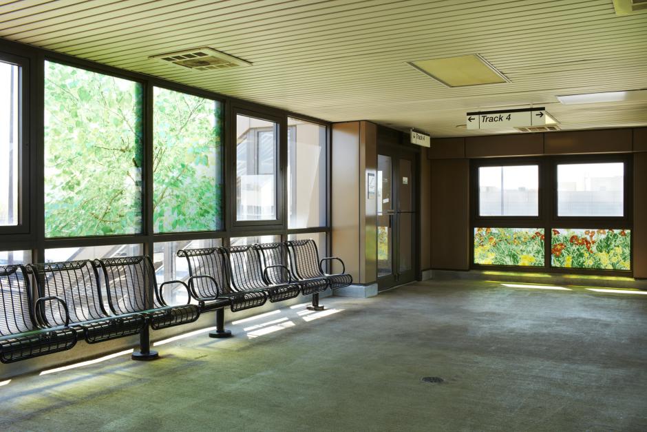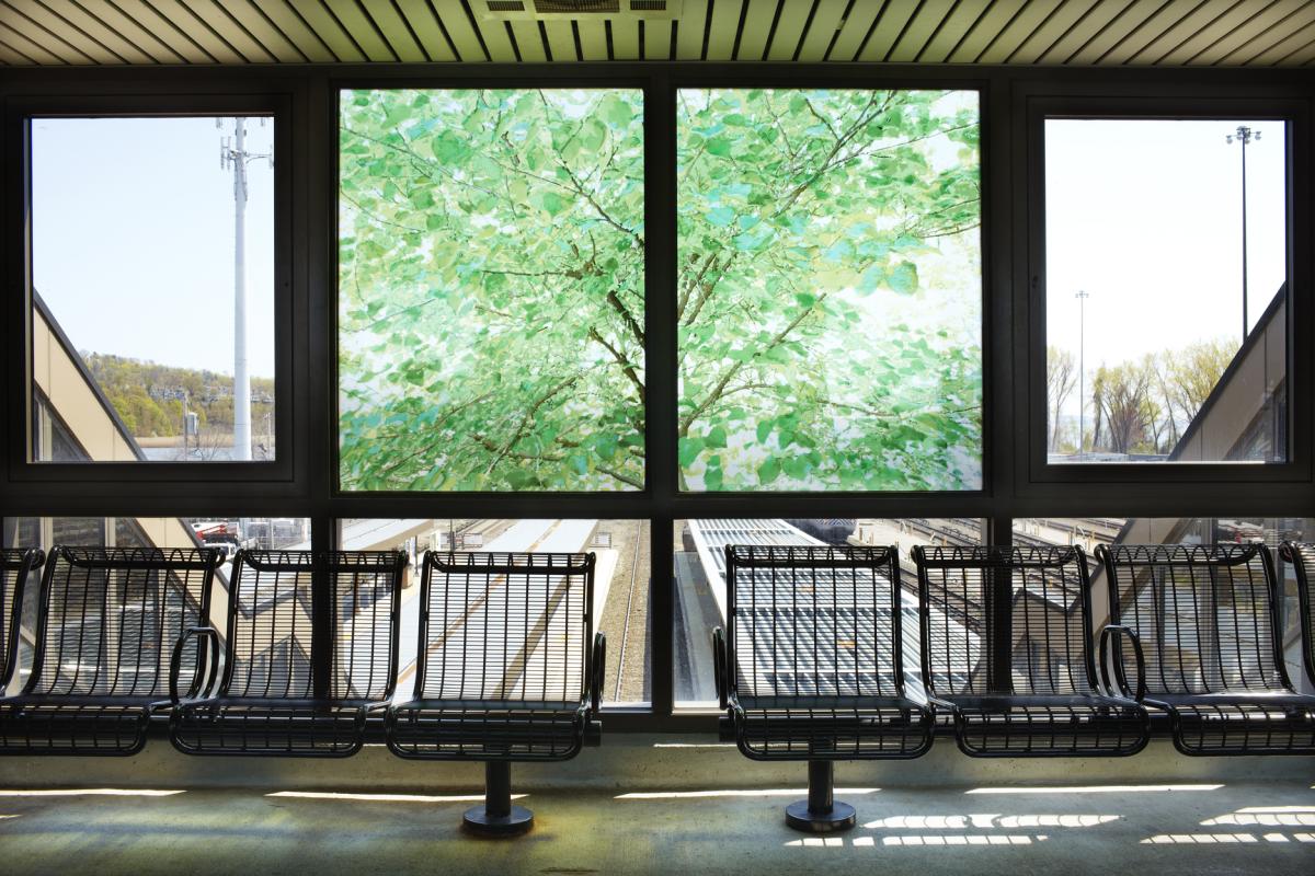 Installed in the windows of the station’s South Overpass in 2013, the laminated glass was fabricated by Glasmalerei Peters Studios in three layers of hand painted glass. Homes in Croton subtly emerge in the background of the artwork imaginary, providing familiar views. Each window is paired with the window directly across, so that the room is sequenced into bands of seasons as commuters walk across the space. For some, this path may allude to the passage of hours: from the quiet of morning, still full of potential, towards the abundance and productivity of the coming day. Once home, the images in reverse signal a calming down, a hibernation of the evening or weekend ahead.
