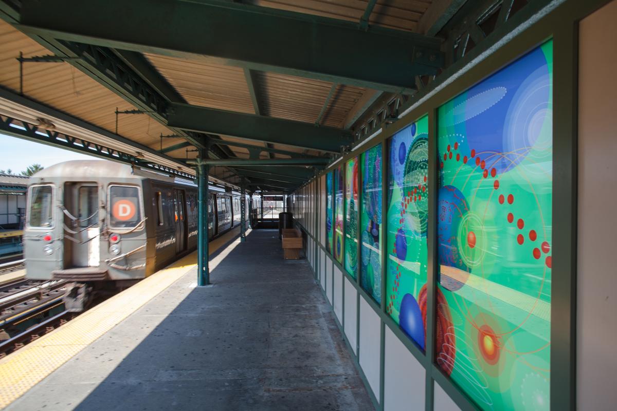 Amy Cheng’s series of four compositions, installed in windscreens along the station's platforms, are designed as imaginative land and skyscapes representing mystery and adventure. They refer to the largeness of life, the wonders and mystery of the natural world, rendered in resplendent color and form.