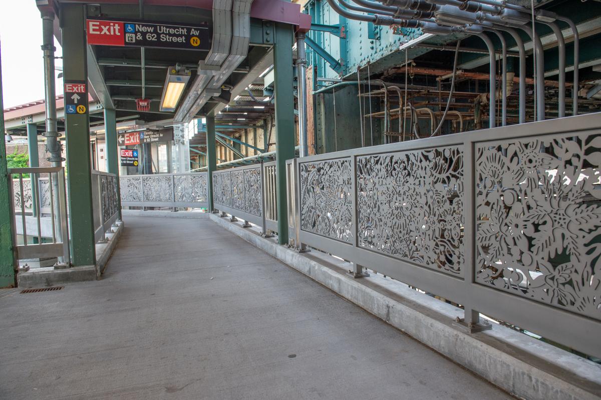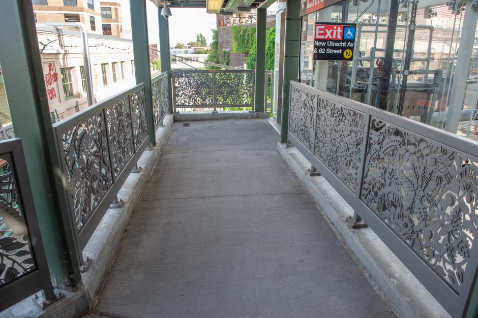“Nature Rail” is a stainless steel sculptural work installed in the railings of the 62 St station’s transfer areas connecting the with the line via the New Utrecht Av station. “Nature Rail” is composed of five modular compositions by Andrea Dezsö, which have been combined depending on the location and configuration of the station railings.