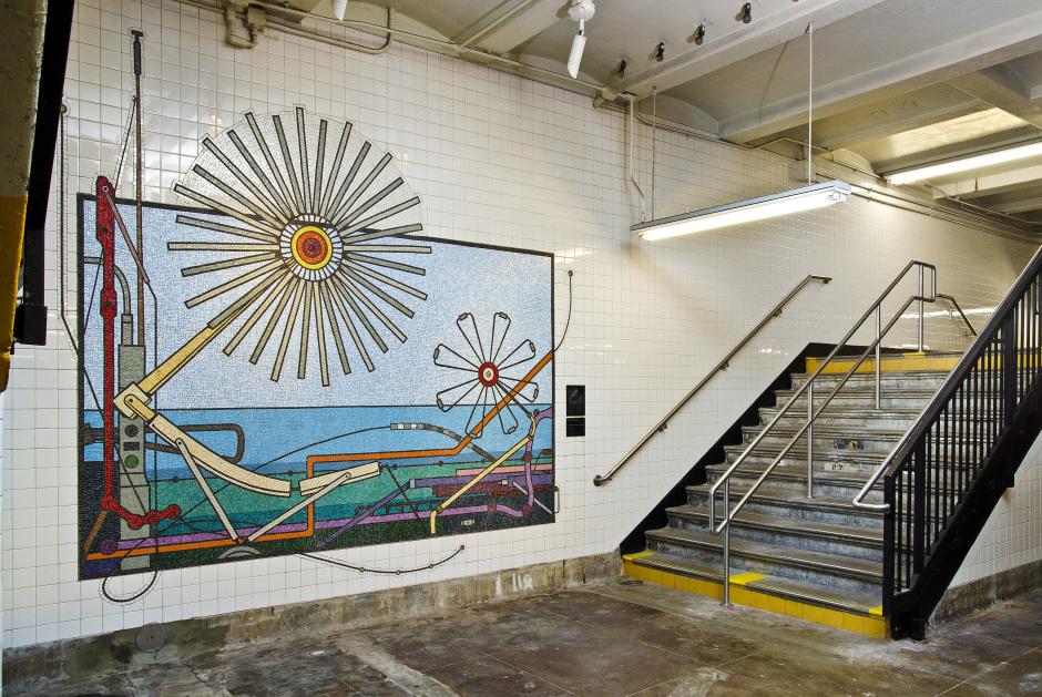 Installed on the wall of the station’s Manhattan-bound platform, "Hunters Point Avenue Project" by artist Tricia Keightley merges elements of Hunters Point’s industrial past with its future.