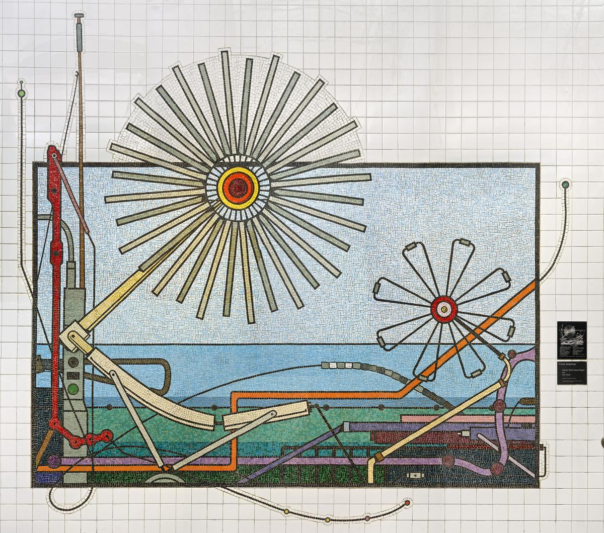 Fabricated in glass mosaic by Miotto Mosaic Art Studios, the artwork features contemporary and historic turnstiles in the form of radiating flowers. The radiating form on the left is built of a multitude of modern turnstiles symbolizing the act each rider makes when entering and exiting the station. The form on the right is made up of the turnstiles used in 1916 when the station first opened. Together, they reflect almost a century of service the station has provided.