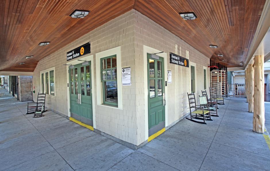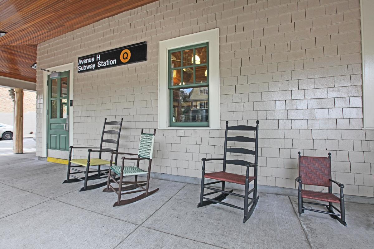 The landmarked Station House at Avenue H in Midwood, Brooklyn was originally built at the turn of the century as a real estate office for the surrounding community of Fiske Terrace. It was an example of a planned suburban development and a neighborhood that's has well-kept homes and landscaped streets. When the station was designated a landmark by the New York City Landmarks Preservation Commission in 2004, the Commission wrote that Avenue H is "the city’s only shingled wooden cottage-turned-transit station house." To celebrate this uniquely charming site, artist Ed Kopel animated the exterior of the building with his piece, "Brooklyn Bucolic," transforming an unused colonnade into an active community porch.