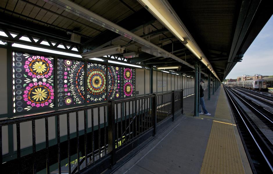 Each image appears like an aerial plan of imagined flower gardens. Using arrangements inspired by mandalas, representing the universe, the flowers have been placed into orbiting combinations of color and shape, preserving what was in bloom on the day that the images were created. The large fantastical flower beds are meant to function as meditation garden for subway travelers.