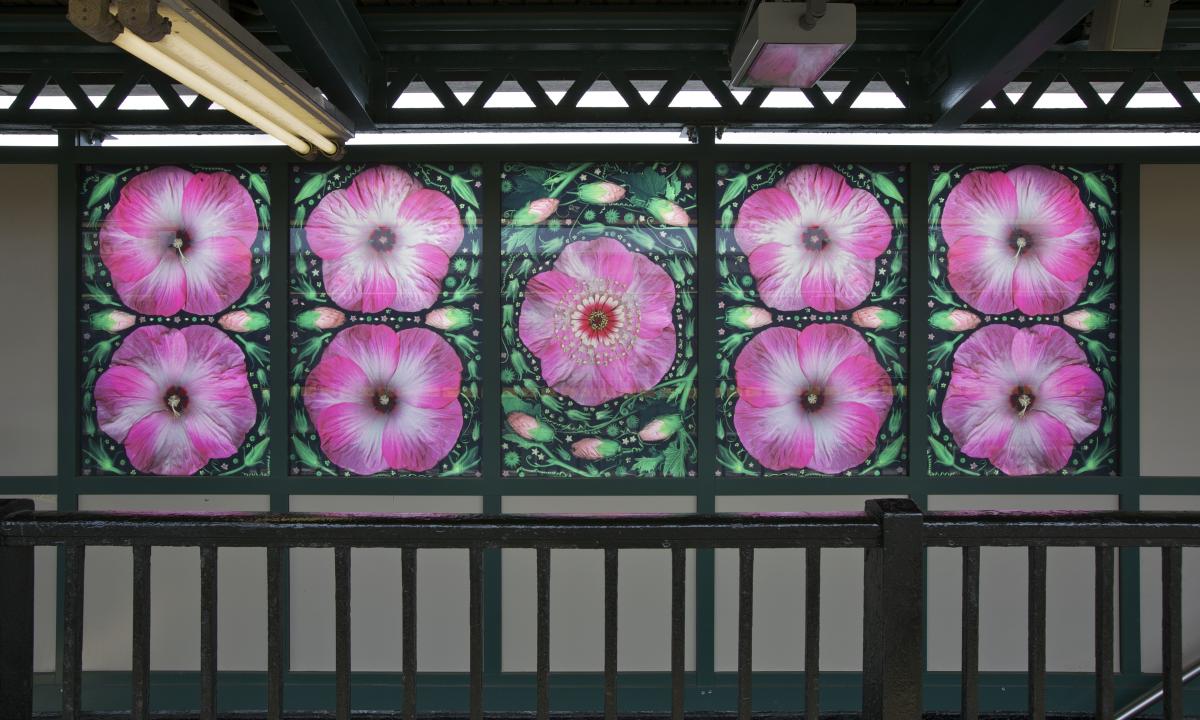 The "Gardens of Fort Hamilton Parkway Station" are six sets of flower compositions in laminated glass, which bring elements of nature onto the subway platform. Artist Portia Munson created the work from digital scans of actual flowers that are realized as larger than life to create fantastical gardens. Each composition represents a garden at different times in the growing season. The first, "Double Happiness," represents early spring. The second grouping, "Peony," is made up of flowers that bloom from late spring in May. The third, "July," depicts mid-summer and the fourth, "Hibiscus," shows flowers commonly seen toward the end of August. The last gardens are "Morning Glory," created in September, and "October," illustrating a garden in late fall. These six different gardens are comprised of flowers that can be seen growing in Brooklyn.