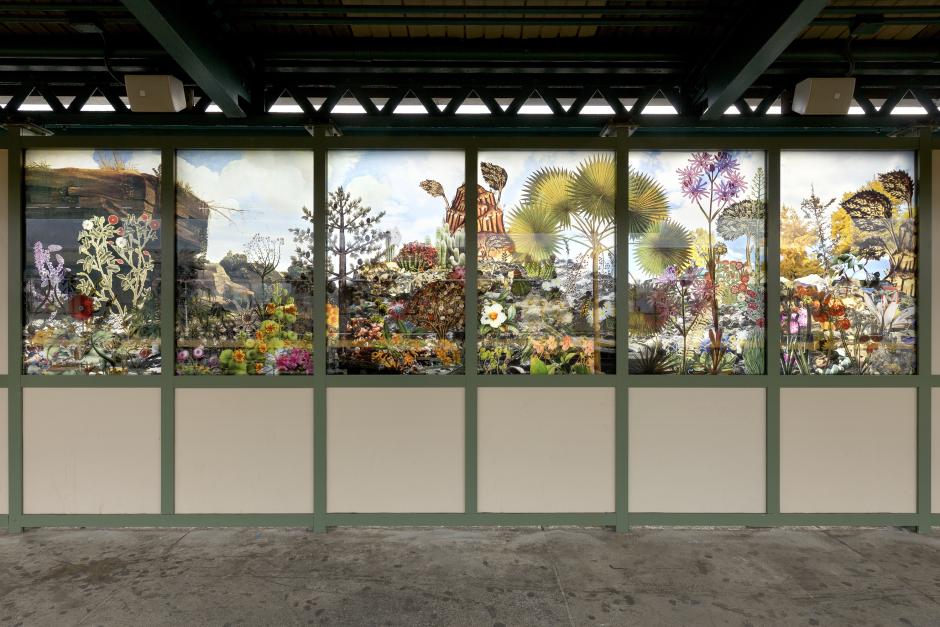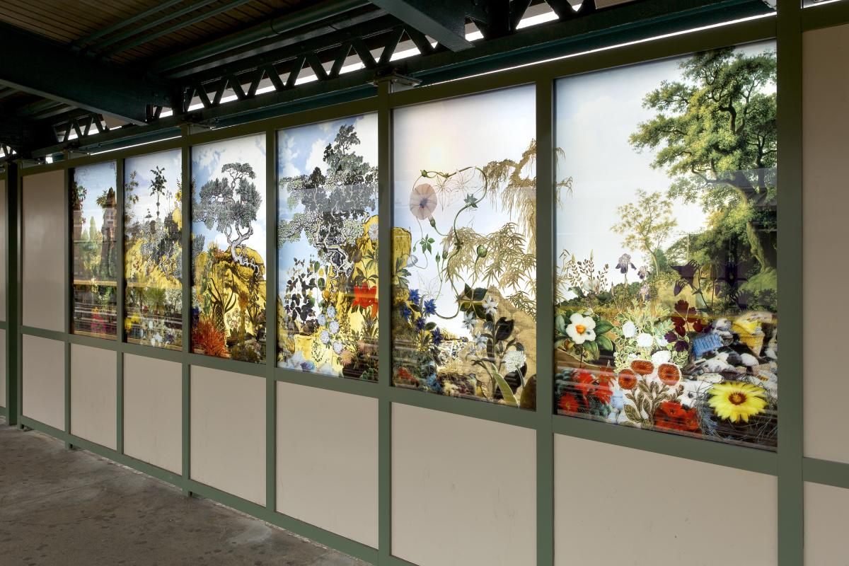 "Bensonhurst Gardens" depicts imaginary landscapes made up of native plants with an unexpected array of flowers growing side by side. The 32 laminated glass panels were created through a process of collage. Simeti selected plants and flowers that are culturally meaningful to the three main ethnic groups currently living in Bensonhurst: Chinese, Italian, and Jewish.