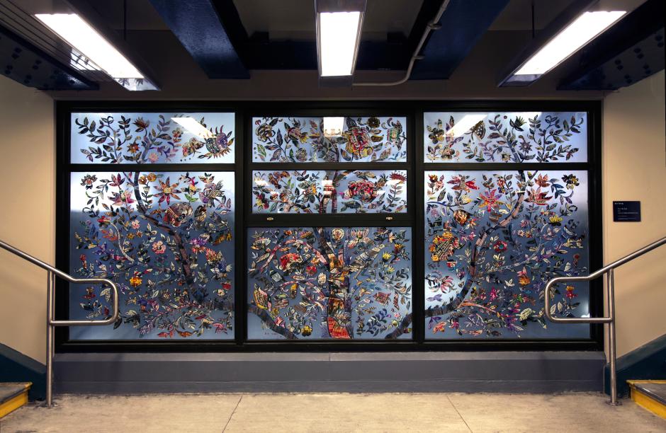Located in the mezzanine window at the Bay Pkwy station, "Tree of Life" bridges the art of contemporary photo collage and traditional Chinese paper cut to evoke the community that surrounds the station in a masterwork of precision and grace.