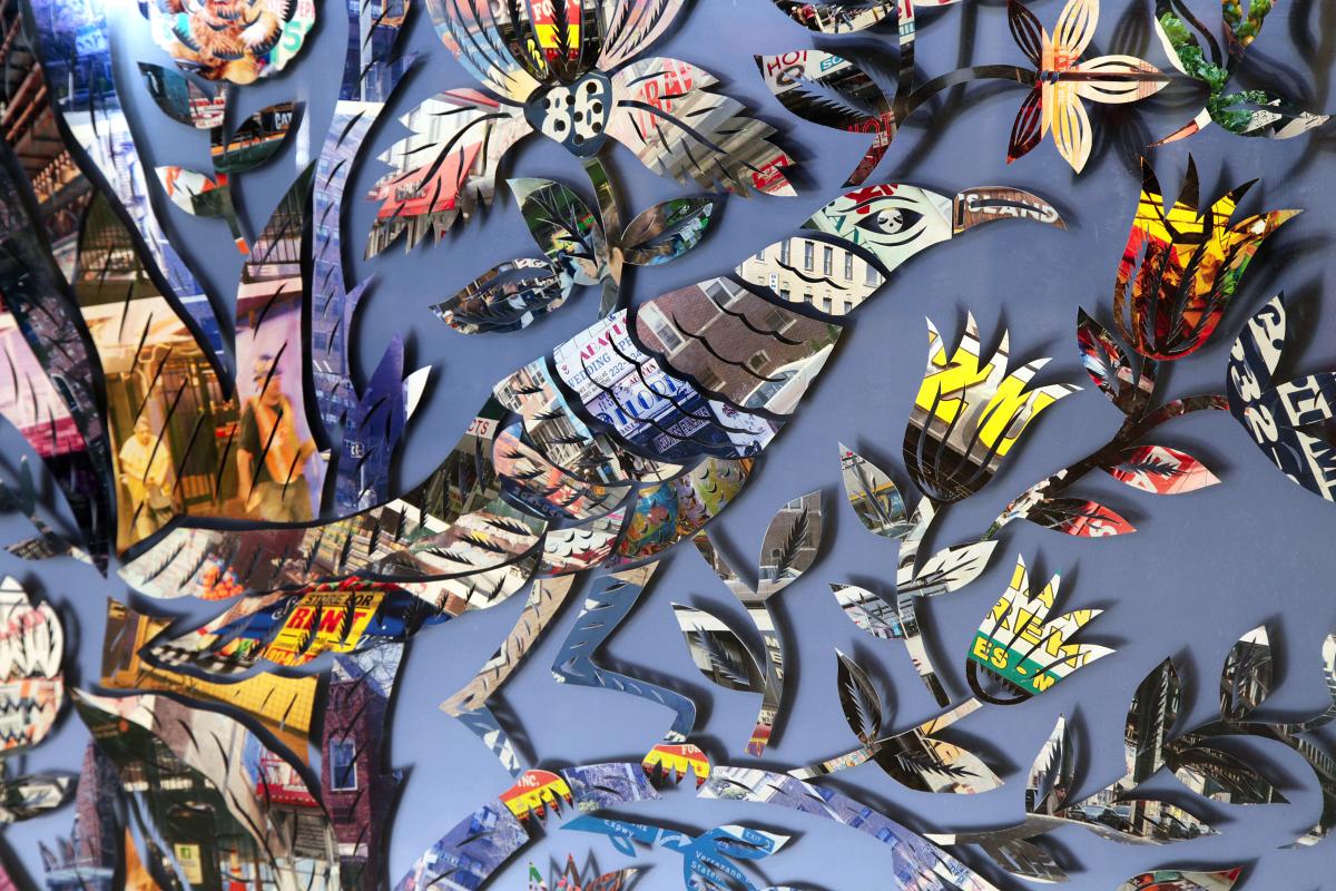 Xin Song began the project by photographing the busy street below the elevated station. Using traditional paper-cutting techniques, she then transformed the colorful imagery from her photos into an intricate pattern, creating a symmetrical and vibrant flowering tree. This unique work is laminated between thick panes of glass and can be viewed from two sides. From the outside of the window, a black silhouette appears, creating a graphic filigree reminiscent of Brooklyn’s historic iron work. The interior view, which serves as the focal point upon entering the station's mezzanine, is a colorful collage of the contemporary life in the neighborhood. For Song, the subway itself, the surrounding neighborhoods and people's daily movements, are the threads that connect the diverse community.