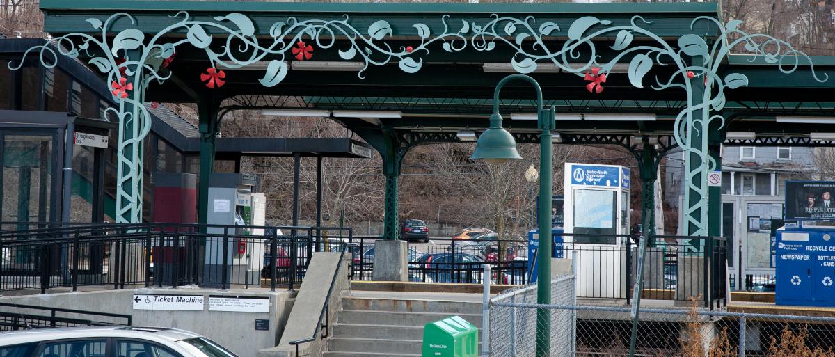 The vines proceed from each side in a roughly symmetrical pattern, meeting over the stairs like a huge arbor welcoming visitors to a vast local garden. Elements of this sculpture are repeated in the two Peekskill monograms atop the elevator entrances and in railing inserts on the northbound platform. The vivid colors and repeating shapes provide a modern, stylized take on historic elements of the station and surrounding architecture. Symbolizing the flowering of the contemporary arts in this historic city, "Jan Peeck’s Vine" welcomes commuters to their historic station. Joy Taylor’s artwork was fabricated by KC Fabrications.