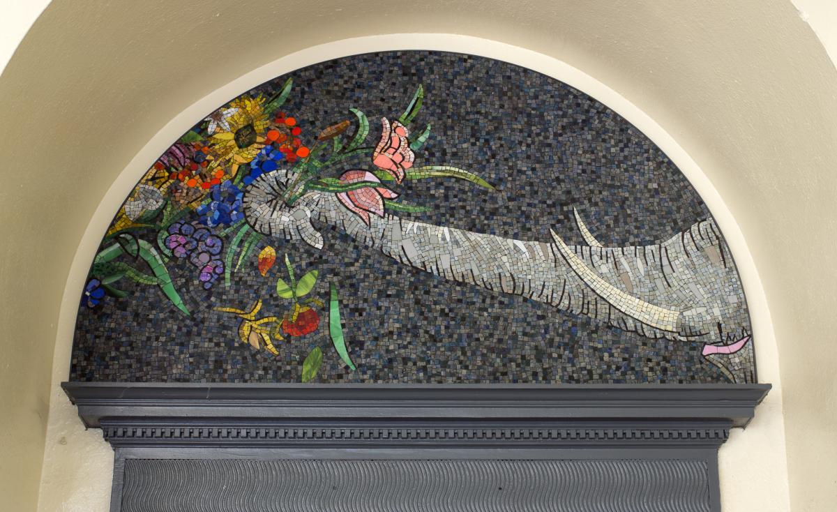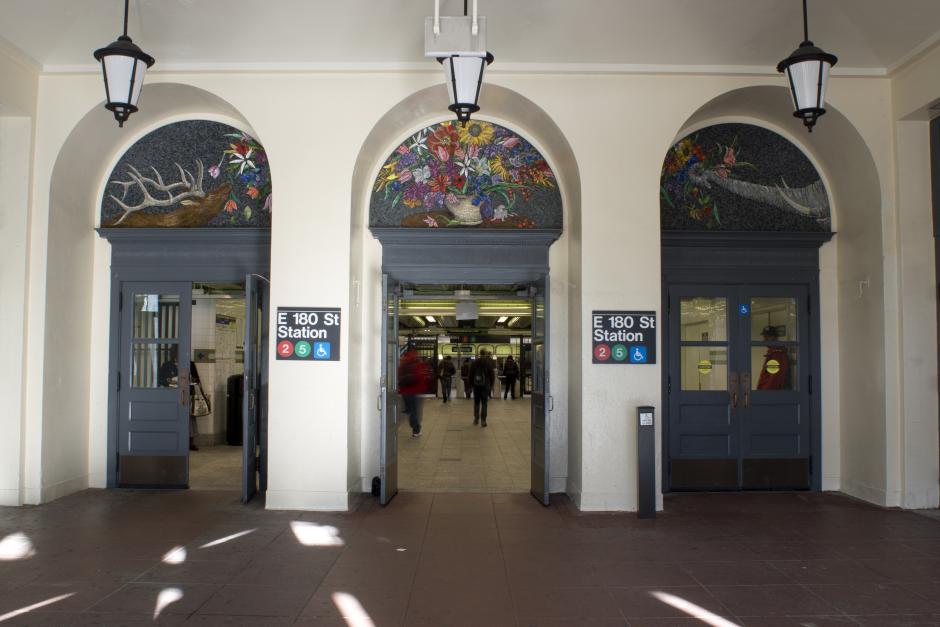 Fifteen unique and site-specific pieces are placed throughout the station. Above the doorway entrance, there are three lush and vibrant floral bouquets with an elk and elephant welcoming the traveler, and serving as a Bronx Zoo reference. Along the corridor, mosaic and glass artworks are on opposite walls. In the windows, glass panels reflect the arches of the historic station, flowers, and vines, creating an illusion of depth and light. On the walls, mosaic frames of silver mirror reflect the thematic arches and complete an effect of calmness sought by the artist, who follows Feng-Shui principles.