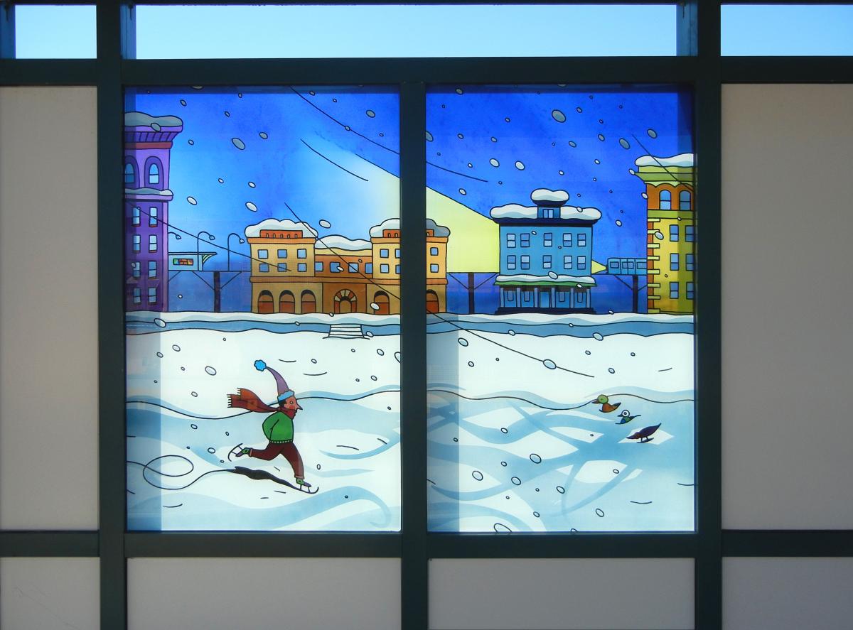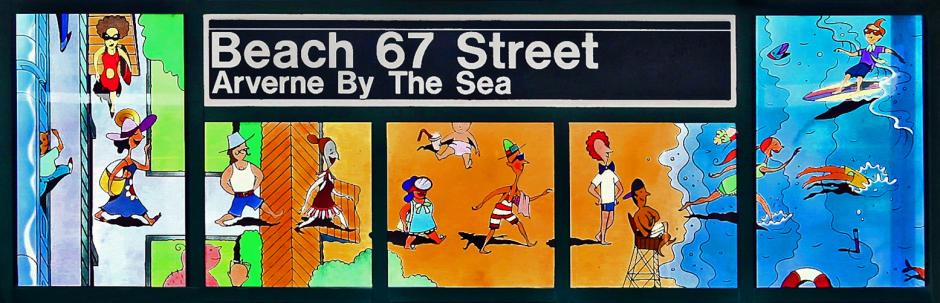 Ingo Fast's series of 17 laminated glass panels for the Beach 67 St station in the Rockaways, is divided between the station's two platforms. Fast creates amusing figures and landscapes, rendered in thin lines, washed in color, and seen from unusual vantage points.