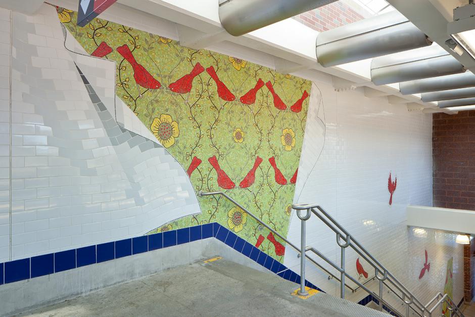 Avenues J and M share this metaphoric motif. Avenue M features a rabbit design with rabbits leaping from the wall and hopping along the station stairs. Avenue J depicts birds who fan out from the patterned wall and seem to fly throughout the station. The creatures appear to have escaped from the old-fashioned wall pattern of the past to join us in the present-day station. The birds and rabbits add a sense of whimsy while at the same time engaging people who use their own forms of transportation. In an inspired flight of fancy, the animals travel to the neighboring stations: a bird is seen mixing it up with the rabbits at Avenue M and at Avenue J, a rabbit hops over to visit with the birds.