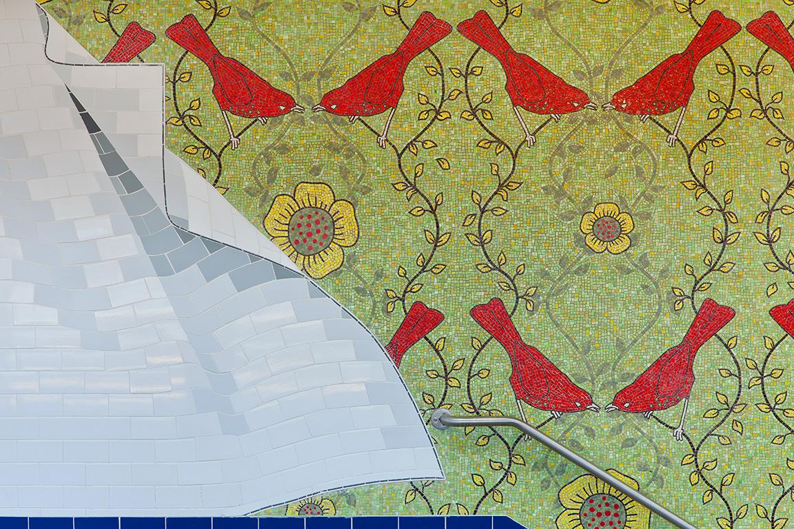Artist Rita MacDonald works with everyday patterns in much of her work, manipulating and enlarging the shapes to fit architectural spaces in her installations and painstakingly rendering each line in her prints. Her patterns are often based upon fabrics from old clothes or well-worn curtains. In her project at the Avenue J and M stations, she puts these practices to good use, creating a Trompe-l'œil effect in which the tile wall is folded back like a curtain to reveal a vintage wallpaper-like pattern behind. The fabricator, Miotto Mosaics, faced a challenging technical puzzle of trimming rectangular tiles to resemble an unfurling form so that it seems as though an invisible hand has peeled back a layer of the wall.