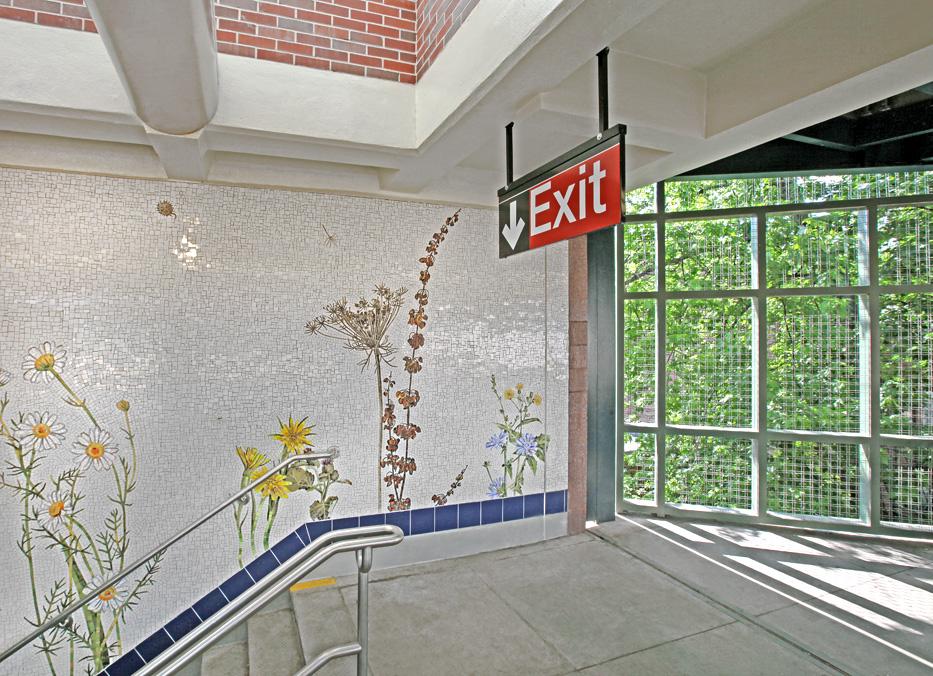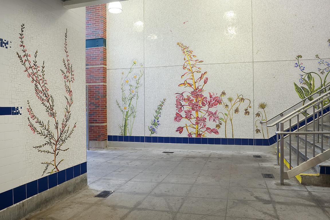 Jason Middlebrook's mosaic installation, "Brooklyn Seeds," is a monumentally-scaled garden of wildflowers climbing up the stair wall extending from Avenue U to the elevated train platform. Created in glass mosaic, the choice of plants is based on local wildflowers that grow in unlikely places, through cracks in the sidewalk, alleys, and walls. Middlebrook's work explores the place where the urban and human-made intersect with the natural to survive and flourish. These flowers, often weeds, include such local specimens as spotted knapweed, burdock, golden rod, aster, milkweed, and daises. Above many of the mosaic plants are airborne seed pods floating away to germinate, on a journey of their own.