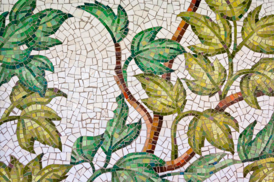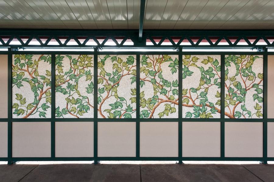 Alison Moritsugu's mosaics intertwine two definitions of the word community. "Community" speaks of both people living in a specific geographic area, as well as plants growing together sharing the same ecosystem. The glass mosaics highlight four plants endemic to the Bronx area. These include Acer rubrum (red maple), Carya cordiformis (bitternut hickory), Rosa palustris (swamp rose), and Smilax rotundifolia (common greenbrier). Woven into the background are images of people from the Bronx. Once the hunting grounds for the early Siwanoy Indians, this area became farmland and later residential developments. Like the natural landscape, populations are continually changing and always in flux.