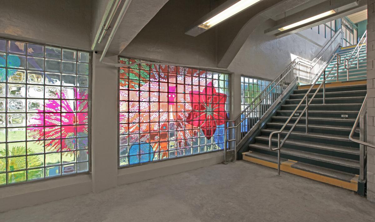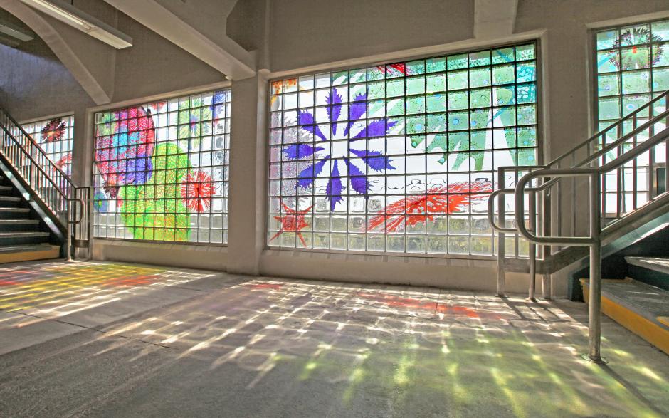 At Beach 44 St, artist Jill Parisi used the scale allowed by walls of glass block to create imaginary sea creatures. They appear to float on the glass in resplendent colors and intricate patterns. These hybrid species are inspired by an unusual marine anomaly nearby, where the Gulf Stream carries various tropical fish to the region. Parisi referenced botanical cross-sections, jellyfish, stingrays, and triggerfish, in order to create the original works on paper that were later translated into the glass medium. These over-scaled and overlapping shapes, and the play of sunlight on the glass, create the sensation that you are looking underwater.