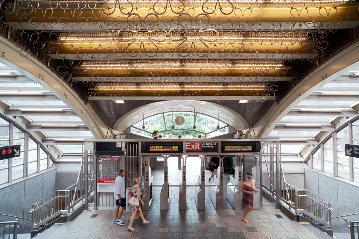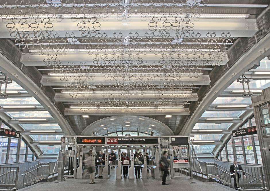 Within the vaulted ceiling area of the station house located on Broadway between 95th and 96th Streets, the artists have created a profusion of flowers that appear animated. The hanging sculptural work consists of 180 polished stainless steel flowers linked together and arranged in rows that flow from the structure's steel traverse beams, creating ethereal layers of reflective surfaces with an almost ghost-like presence.