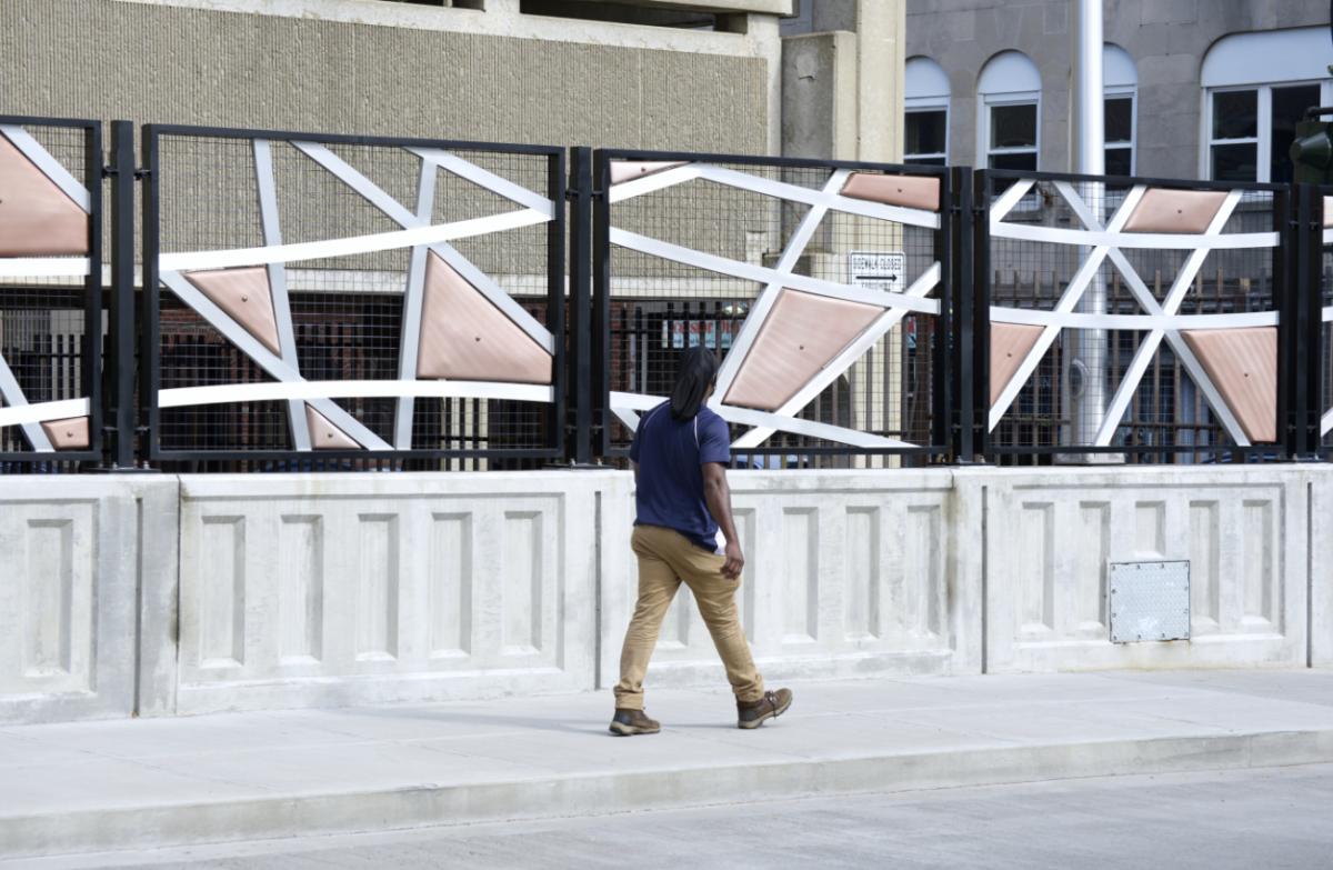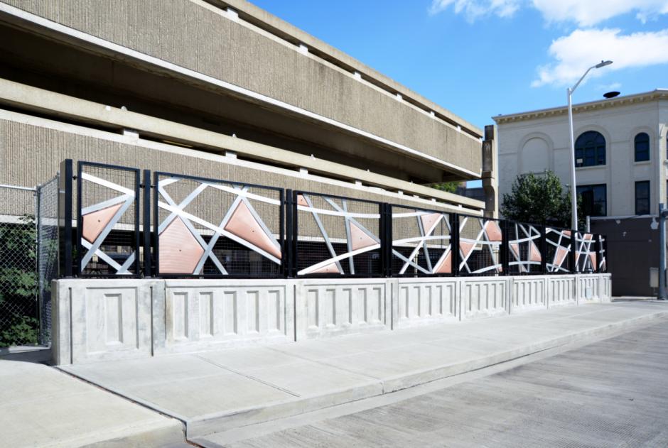 "CROSSCUT" is an interactive artwork for the 6th Avenue Bridge by Josué Guarionex that unites those passing by with the universal language of music. The artist was inspired by the history of Mount Vernon and its familiar story of changing communities to imagine an artwork that brings together many types of people in a shared experience. Fabricated by KC Fabrications, polished aluminum bars based on the train tracks running below crisscross and create a dynamic visual rhythm. Geometric forms derived from the percussion instruments of various cultures are interspersed in the open space and invite the community to play by hand.