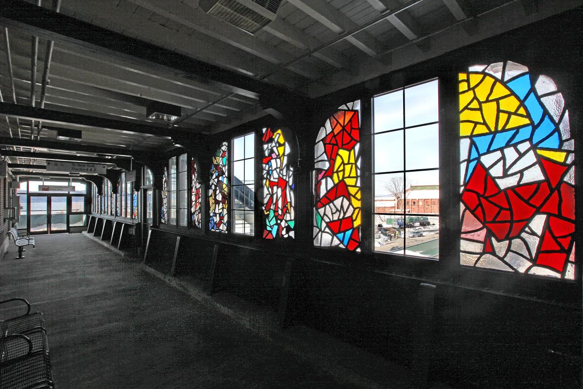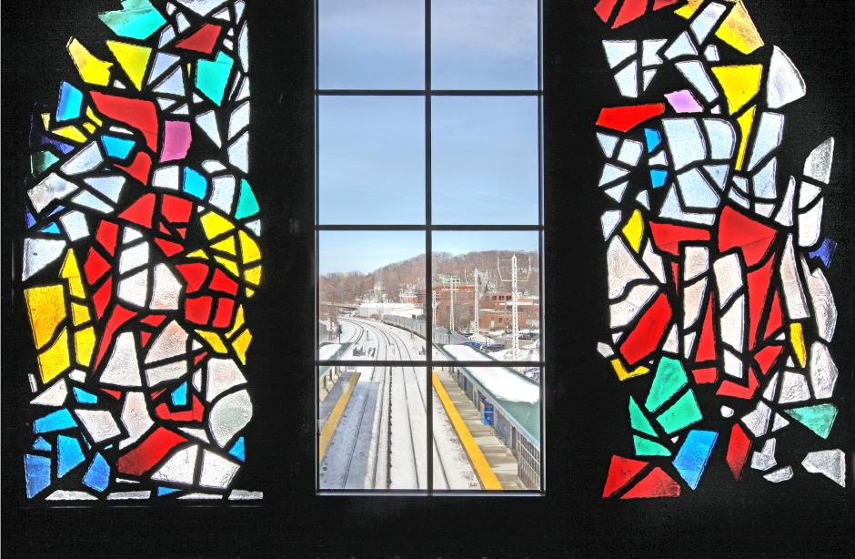 Robert Goodnough's “K—M—G” adds cheer to the overpass of Metro-North Railroad's Ossining Station with the dynamic variation in light coming through the colored glass artwork during the course of the day.