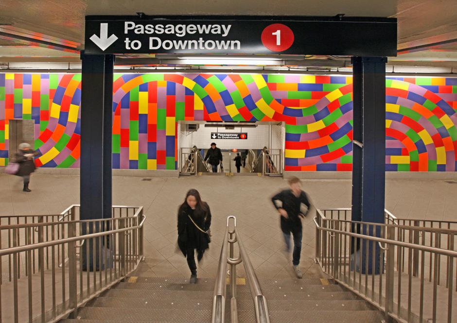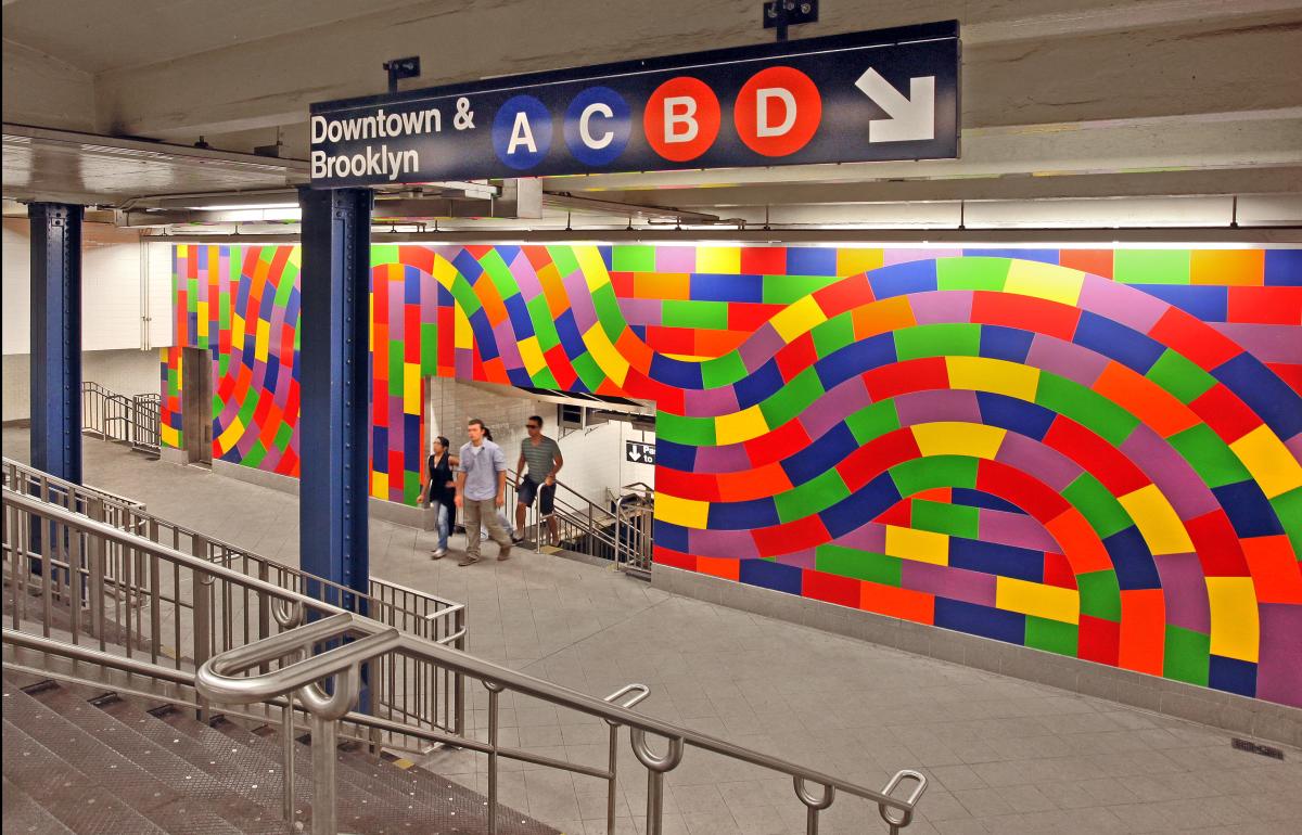 A monumental and vibrant porcelain tile wall drawing by Sol LeWitt has been installed at 59th Street-Columbus Circle. The artist created the proposal in 2004 and, working with Dattner Architects, selected the site in an expansive wall facing a double-wide stairway and landing that leads from the mezzanine to the platforms of the A, C, B, D and 1 trains. Titled “Whirls and twirls (MTA),” the artwork is 53 feet wide and by 11 feet high and consists of 250 porcelain tiles in six colors, each cut to meet the artist's specifications. The artist created the drawing/maquette for the project, reviewed and selected materials, and approved color samples prior to his death in 2007.