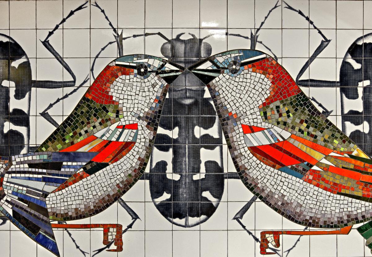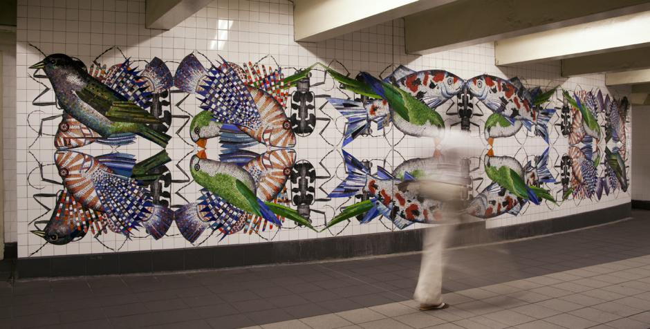The artwork - created in glass mosaic based on Snead's original paintings - features species that have migrated to Brooklyn as well as one species that is departing. He arranges the species in layers that can be seen from left to right: European starling (originally from England), a house sparrow (Europe), Red Lion fish (Indian Ocean), Monk parrot (South America) and Koi (Japan). The Tiger Beetle is represented on a tile background; a local species that is in decline. The result is a bold and graphic set of images that intrigue and delight passersby during their own departures and arrivals.
