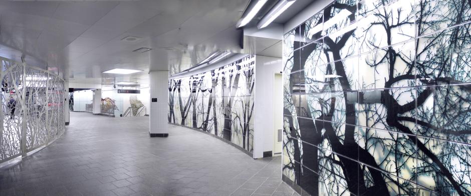 The monumental work at the South Ferry Terminal by Doug and Mike Starn investigates the nature of objects and transformation using light and documentary sources. A fused glass wall reveals images of tree limbs and leaves in silhouette adapted from photographic imagery. These formations relate to the place above, Battery Park, the historic fortress and Manhattan's southern boundary. The glass brings light and poetry to the station.