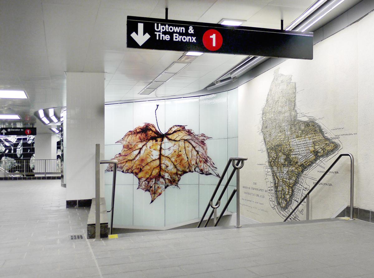 Companion pieces show a decayed over-scaled leaf that refers to the passage of time and links the park to its historical role. A map, that shows contemporary Manhattan and old New York as an overlay, is a beautiful mosaic and eloquent expression of the city's evolution, conveying to the throngs who use the station, a sense of its significant location. The artists designed a laser-cut stainless-steel fence to separate the entry from the paid section of the station; its leaf motif connects the art in the station with the surrounding environment.