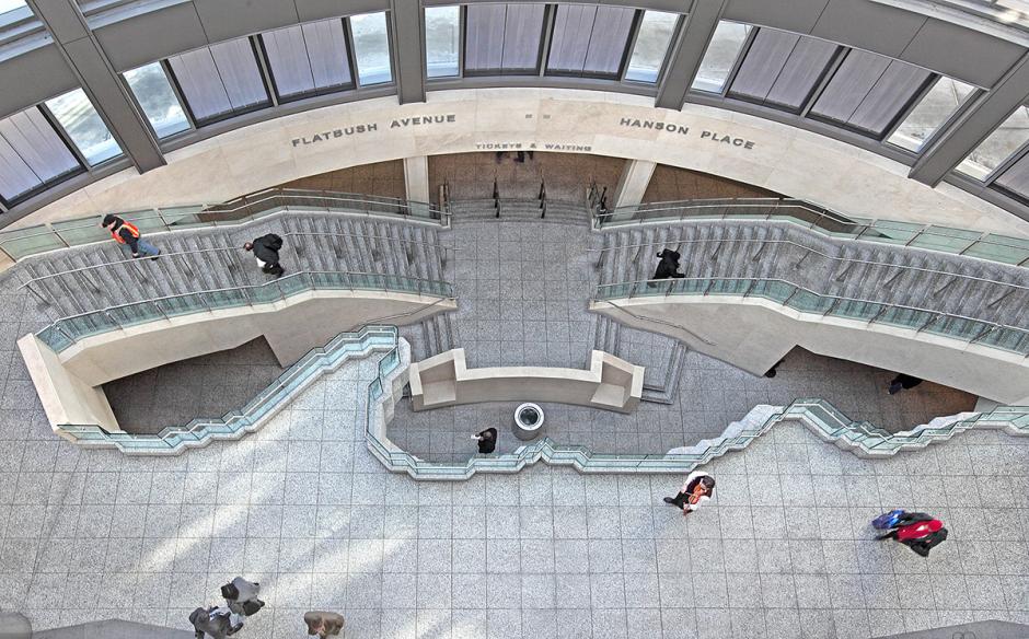 The Long Island Rail Road Atlantic Terminal station in Brooklyn features an artist/architect collaboration in a soaring, light-filled atrium. The project architects, di Domenico + Partners, collaborated with the artists, Allan Wexler and Ellen Wexler, to create a special place of arrival in the entry pavilion that reaches from the street level down to the ticket office, waiting room, and subway entrances.