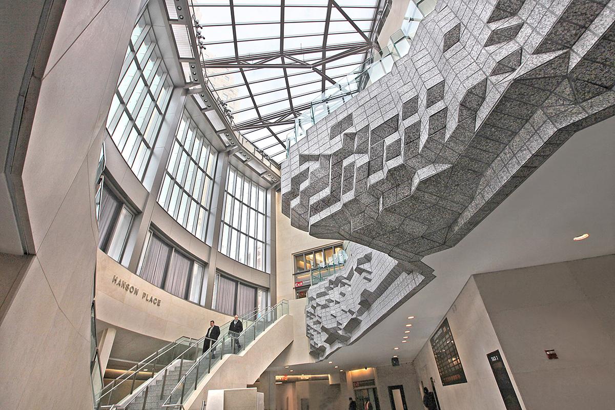 "Overlook" is framed by a pair of sweeping staircases and a glass and stainless steel balcony/railing that flows with the architecture of the space, which promises to be a Brooklyn landmark, akin to Grand Central Terminal's famous clock.