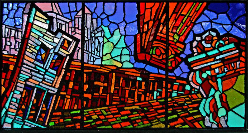 This series of faceted glass panels depicts fallen buildings comforted by blooming flowers to signify New York's resilient spirit. It also represents the Bronx, continuously renewing itself and blooming with vibrancy in expected and unexpected places.