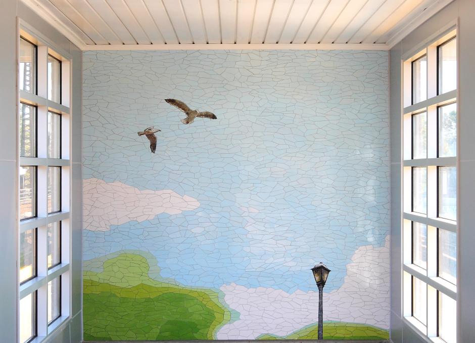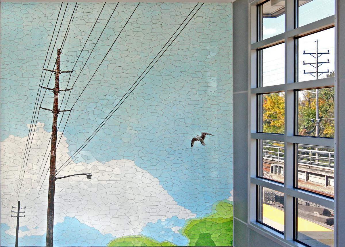 Two other large mosaic panels hang above the west stairway and escalator, showing a pale blue sky with a touch of green at the bottom, a seagull in flight, and floating clouds. The works bring to commuters a painter's sensibility with views of the rolling lawns and shrubs of the close-by suburbs, under expansive skies.