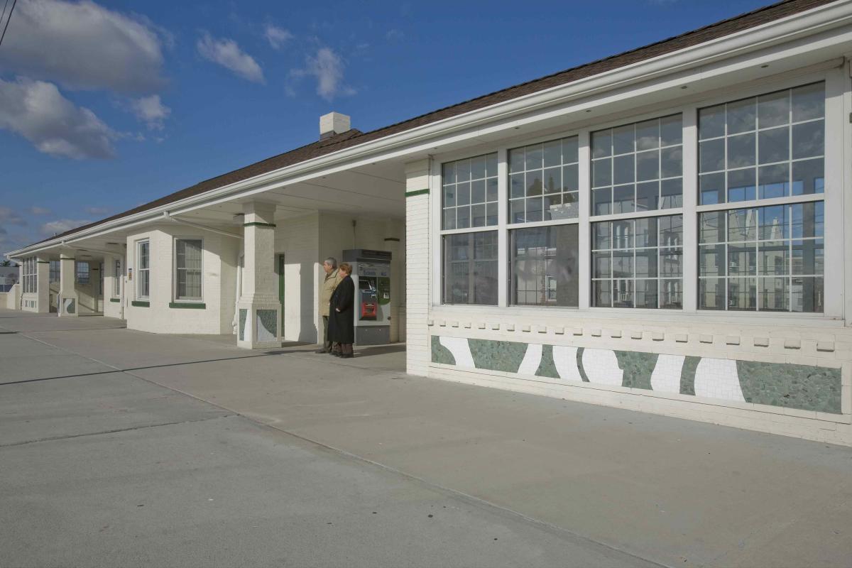 Using celadon fragments, artist Jean Shin created large-scale mosaic murals that feature the shapes and silhouettes of pottery. The mosaics are installed on the south stair walls (facing Northern Boulevard) and in architectural niches in the station building. The vessel or teapot forms were created from thousands of celadon fragments, hand-selected and donated by the city of Icheon, South Korea. The grayish-green forms against a white tile background create an abstract interplay between the positive and negative colored shapes. The aesthetic appeal of celadon lies in its eloquent beauty and simplicity. Derived from ancient China and perfected in Korea, celadon wares are among the most widely admired of Korean ceramics.