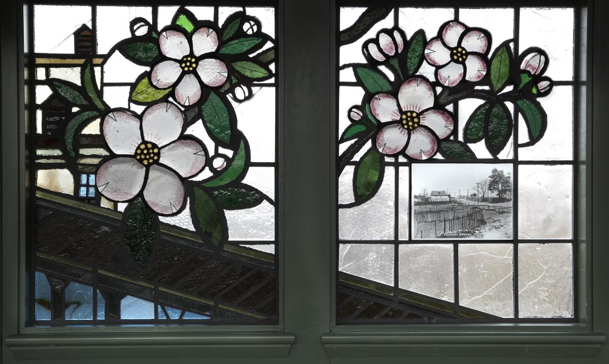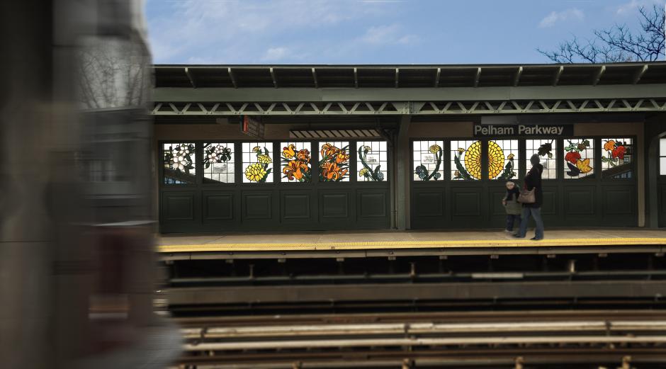 Tomie Arai's “Back to the Garden” consists of 24 faceted glass windows at Pelham Parkway in the Bronx. The work contains seasonal floral imagery-spring blossoms, summertime wallflowers, and autumn foliage. The species shown are common to the area of Pelham Parkway, which links Pelham Bay Park with the Bronx Zoo, and New York Botanical Garden. Highlighting the historic nature of the station and the community, Arai insets historic black and white photographs into her colorful images. The photos have been screened and fired onto the glass surface. Taken from archival photographs, they span the period from 1899 to 1969 and capture views of the surrounding streets and buildings. The artwork's title refers to lyrics in a Joni Mitchell song about returning to the simple life, the life back in the garden.