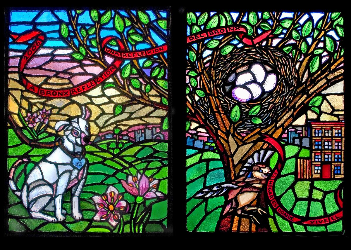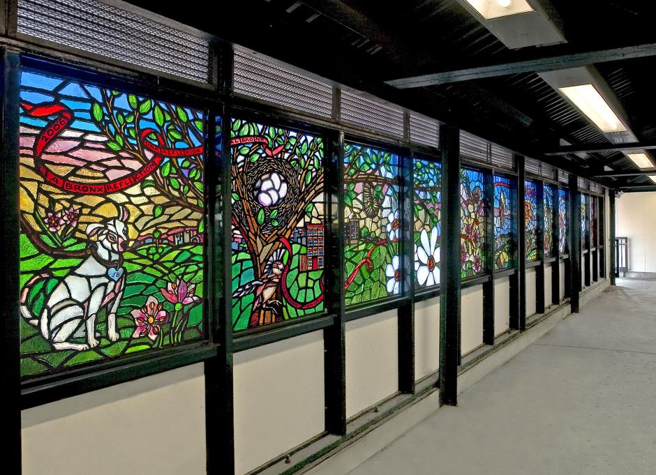 "Home is where the heart lives," a quote by artist Carol Sun's brother, captures one of the themes of A Bronx Reflection. Through colorful faceted glass windows along the east walkway of the station, Ms. Sun portrays a metaphorical reflection of the Bronx, capturing an illustrated timeline of the past, present, and future. She includes various outdoor scenes, along with images of pleasant experiences of home and community life. Capturing scenes of school buses, basketball games, and wildlife, Carol Sun reflects upon fond childhood memories in the Bronx.