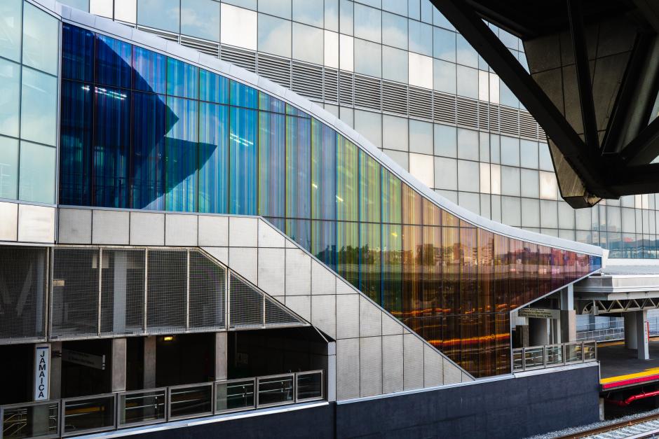 "Radiant Memories," James Little’s vibrant laminated glass artwork at the LIRR Jamaica station, incorporates layers of colorful intricate lines that together form flat gradated blocks of color, creating a sense of movement and animation as the light shifts throughout the day.