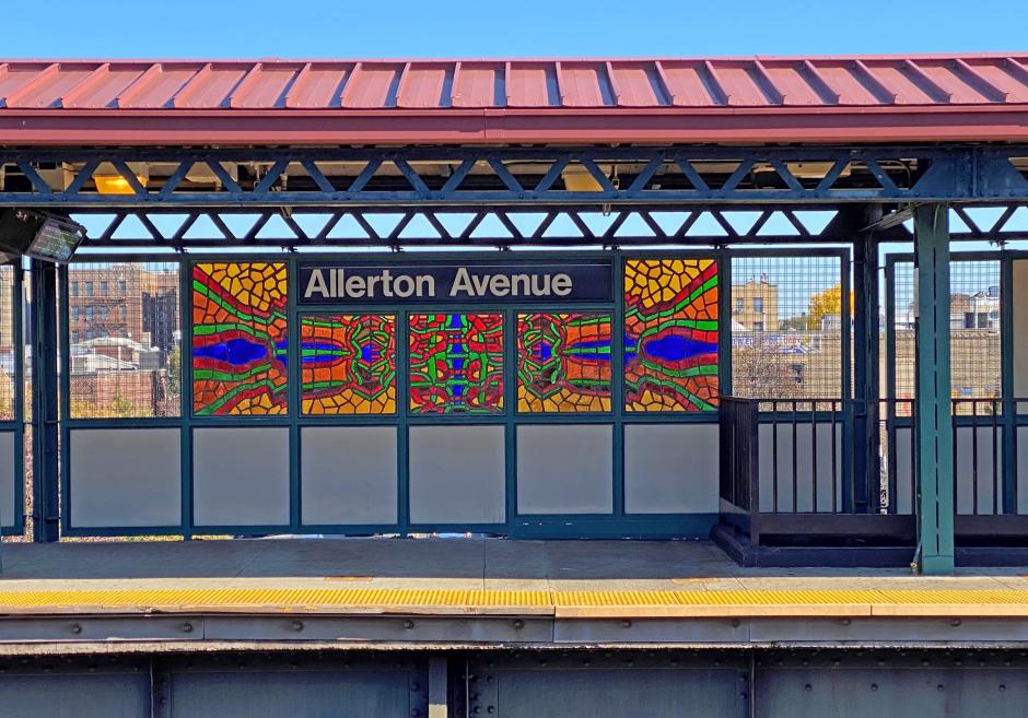 The abstract patterns seen in Michele Brody's faceted glass art are based on subway lines that run from the Bronx through Manhattan to Brooklyn, as represented graphically on the MTA subway map. In the first stage of the work, Brody extracted the red and green lines and transformed them through a process of extrapolating, twisting, turning, and layering them. The final product, in faceted glass, captivates the viewer's attention with interlocking streams of colors. Fabricated into 20 panels and placed on the subway platform for viewing from inside and out of the station, the work is full of movement that reflects the motion of a subway train.