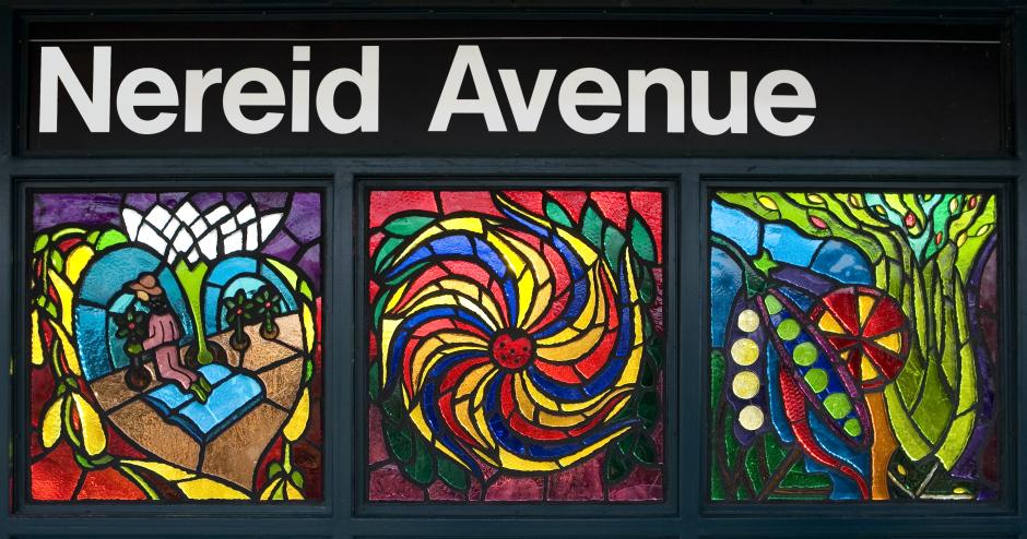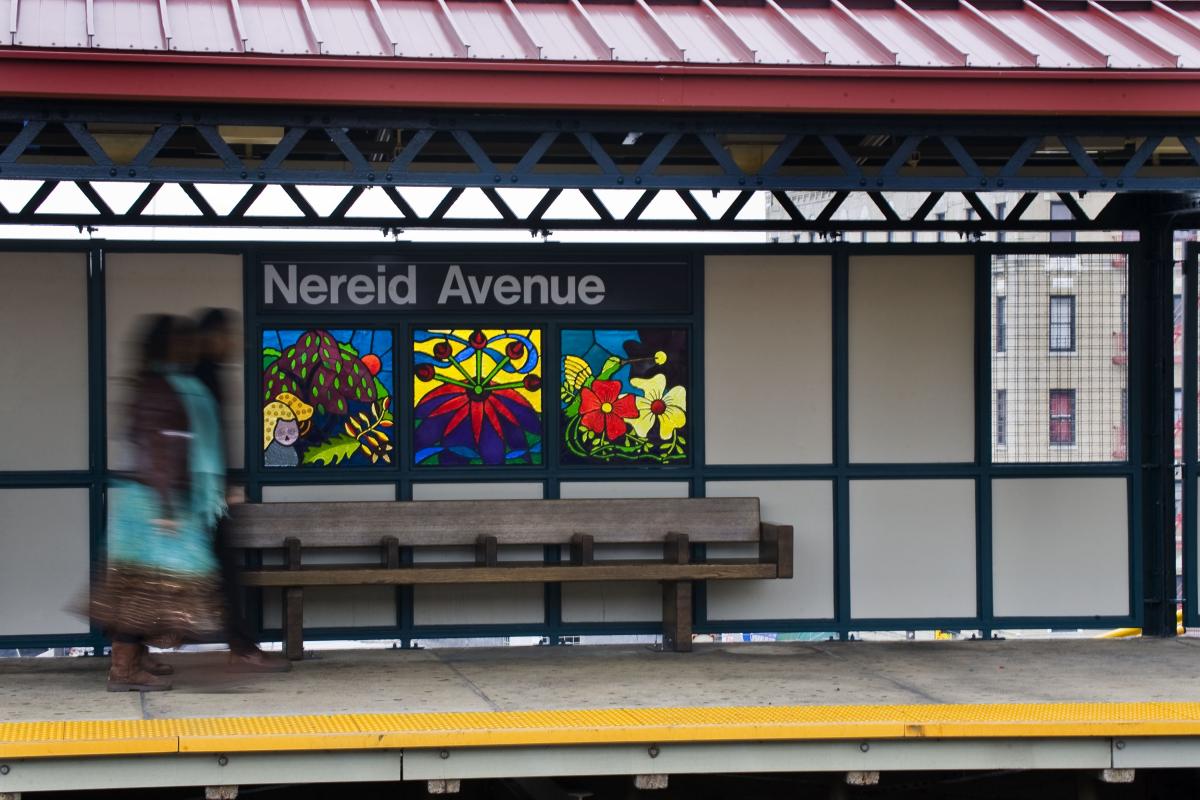 Noel Copeland's artwork celebrates the abundance of flora and fauna in the Bronx. “Leaf of Life,” honors the parks and gardens within the area, such as the Bronx Botanical Garden, the famous Bissel Gardens, the Bronx Zoo, as well as local community gardens. Recreating the organic forms and structure found in nature, the Copeland’s design transforms the station with radiant faceted glass panels located on the station platforms.