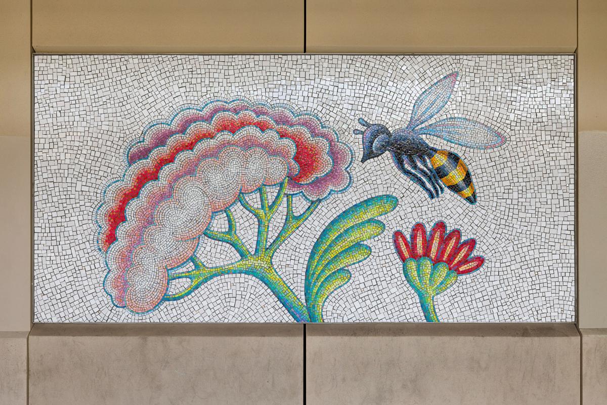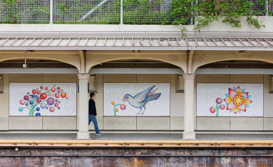 Andrea Dezsö's "Nature Wall" features 14 glass and ceramic mosaic panels, fabricated by Miotto Mosaic Art Studios and placed along the Northbound and Southbound platform walls of the New Utrecht Av station. "Nature Wall" conceptually and aesthetically expands on Dezsö’s nearby metal artwork, "Nature Rail," located along the pedestrian transfer bridge of the adjoining 62nd St station on the D line. Using "Nature Rail"'s characteristic visual elements — specifically, plants and animals surviving on the urban stage — Dezsö composed a cascading set of mosaic murals, re-contextualizing her unique visual iconography and infusing vibrant color onto the station’s platforms. The plant and animal motifs borrowed from "Nature Rail" link the two stations by offering visual continuity, while the different medium of mosaic creates a distinct visual identity for the New Utrecht Av station.