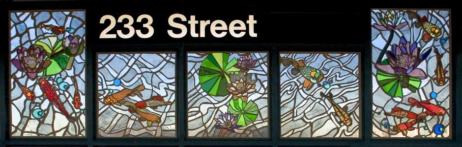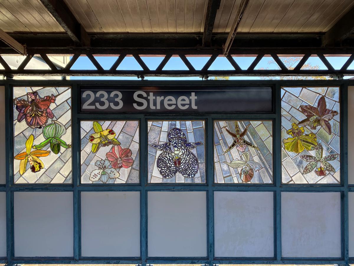 Through her faceted glass artwork, Skowmon Hastanan wove a variety of flowers and animal life into the station for the public to enjoy. Reflecting on the nearby New York Botanical Garden, images of fish, flowers, and greenery transform the station environment, providing commuters with a beautiful, luminous scene to contemplate. Skowmon created a sanctuary from the chaos and stress of daily life, providing a source of energy and rejuvenation in her detailed renderings in glass windows.
