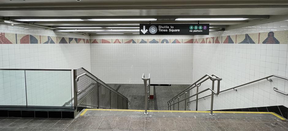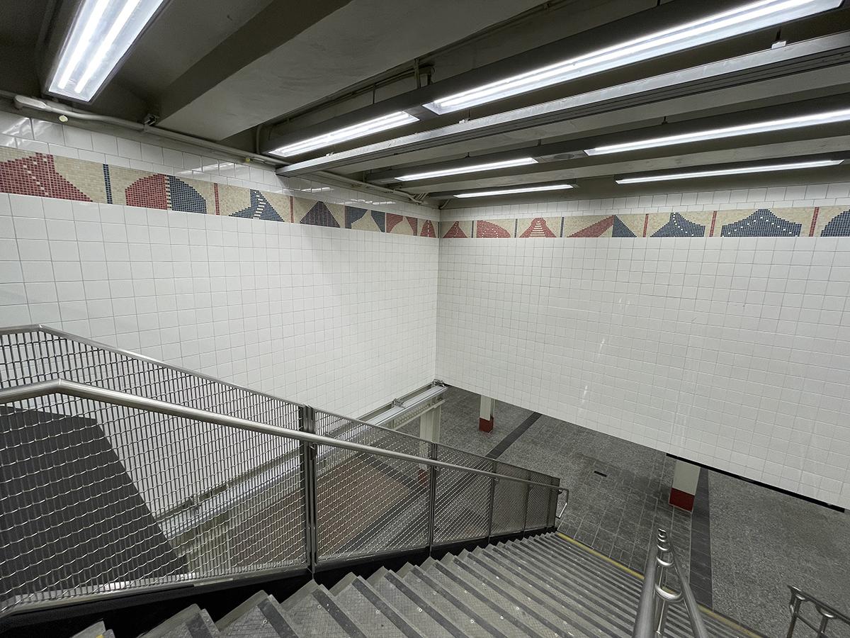 As part of the recent upgrades to the 42 St Shuttle, Jackie Ferrara’s “Grand Central: Arches, Towers, Pyramids” (2000) was expanded to span the new six-car length of track 4 and wrap new stairs from the mezzanine. The project was originally conceived as a skyline for the underground passageways and waiting areas of Grand Central Terminal. Rendered as an expansive mosaic band more than 1,500 feet long, the artwork brings architectural views down below into the busting station. Original artwork and expansion were fabricated by COLORCO Ltd.
