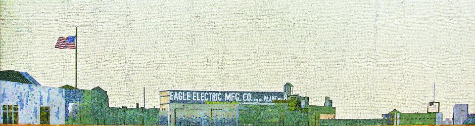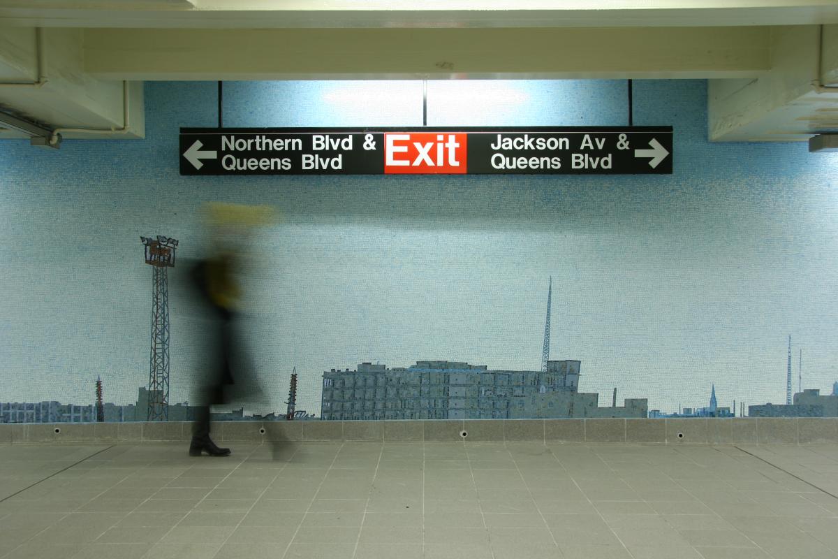 In “Look Up, Not Down,” Ellen Harvey asks riders to pretend that they are gazing skyward at the view that exists above the station. Her series of mosaic murals depict the sky on a sunny day, with the skyline forming a thin frame at the bottom of each mosaic – representing the actual cityscape at the time it was created. The work guides travelers to the surrounding streets around this busy transportation hub. The art celebrates the romance of the skyline as seen from Queens, imagined as the center of the city. Designed in the wake of 9/11 during a time when the New York City skyline brought associations of loss, “Look Up, Not Down” shows the city skyline as an image of hope and beauty. The sun marks the former location of the World Trade Center. In years to come, as the city continues to reinvent itself, the mosaics will serve as a view of a past moment in time.