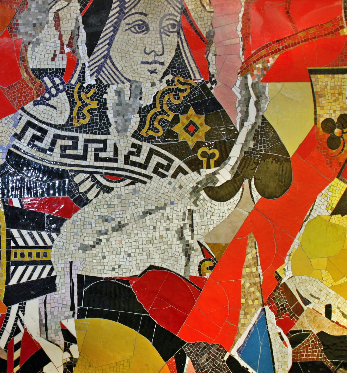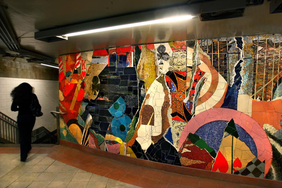 Stephen Johnson describes his mosaic mural and his inspiration for the energy it conveys this way, “My idea for these murals is to convey a sense of joy through an exuberant juxtaposition of colors, shapes, and familiar images... On the surface, the variety of colors and shapes in the mosaics resemble collages and invite the traveler to consider the multiple layers of images found on city walls, particularly in the subway, where posters may tear, revealing previous images and forming exciting compositions... The glass is as diverse as the station's passengers, whose ethnic origins stem from Asia, Africa, and the Middle East... I wanted the abstract design to be balanced with realistic images that people can instantly get." The work brings vibrancy and texture to the station environment.