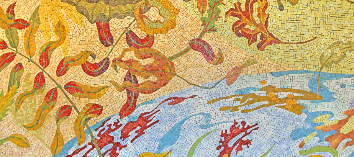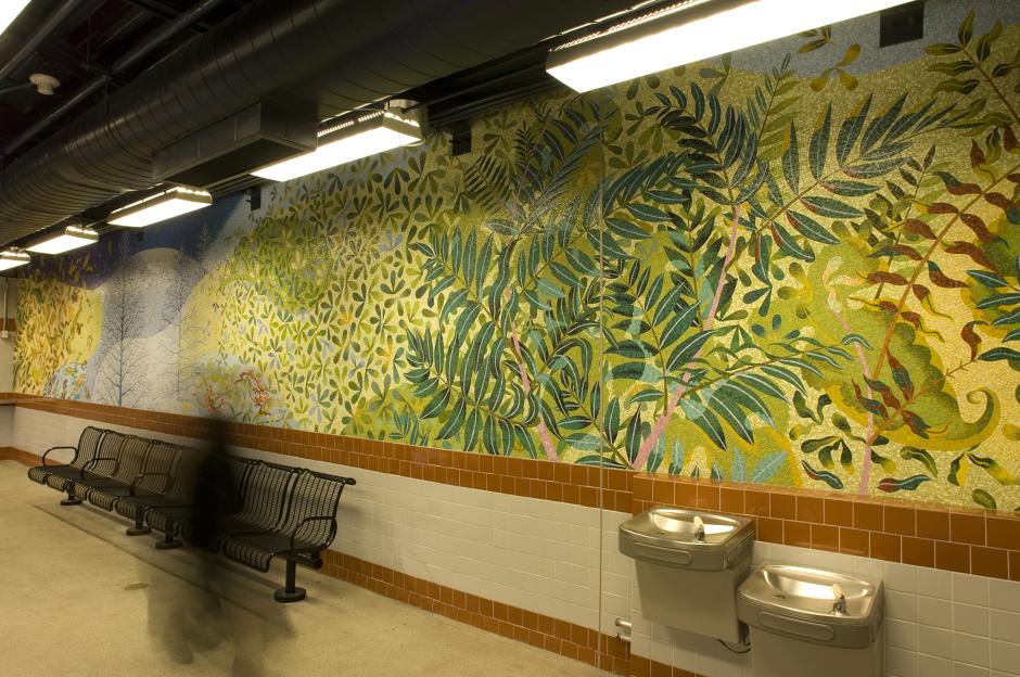 “The Four Seasons” mosaic mural shows the passing seasons in suburban Larchmont through a study of local plant forms. The work brings lushness and soft color to the waiting room, providing an inviting atmosphere. In the words of the artist, Joy Taylor, "Leaves are so commonplace in nature that we rarely consider them worthy of study. Yet when looked at closely they reveal themselves as marvels of efficiency and beauty. In a train station, time often means minutes to hurry or to wait through. But this mural allows the traveler an opportunity for a different view. Like a timeline, this mosaic reveals nature as a vehicle of change. Combining nature and time, I encourage the viewer to examine such changes and to appreciate the precious and fleeting quality of our world. The commuter may take a walk into April, or recall November, even as she hurries to an appointment, or as he heads home from work."