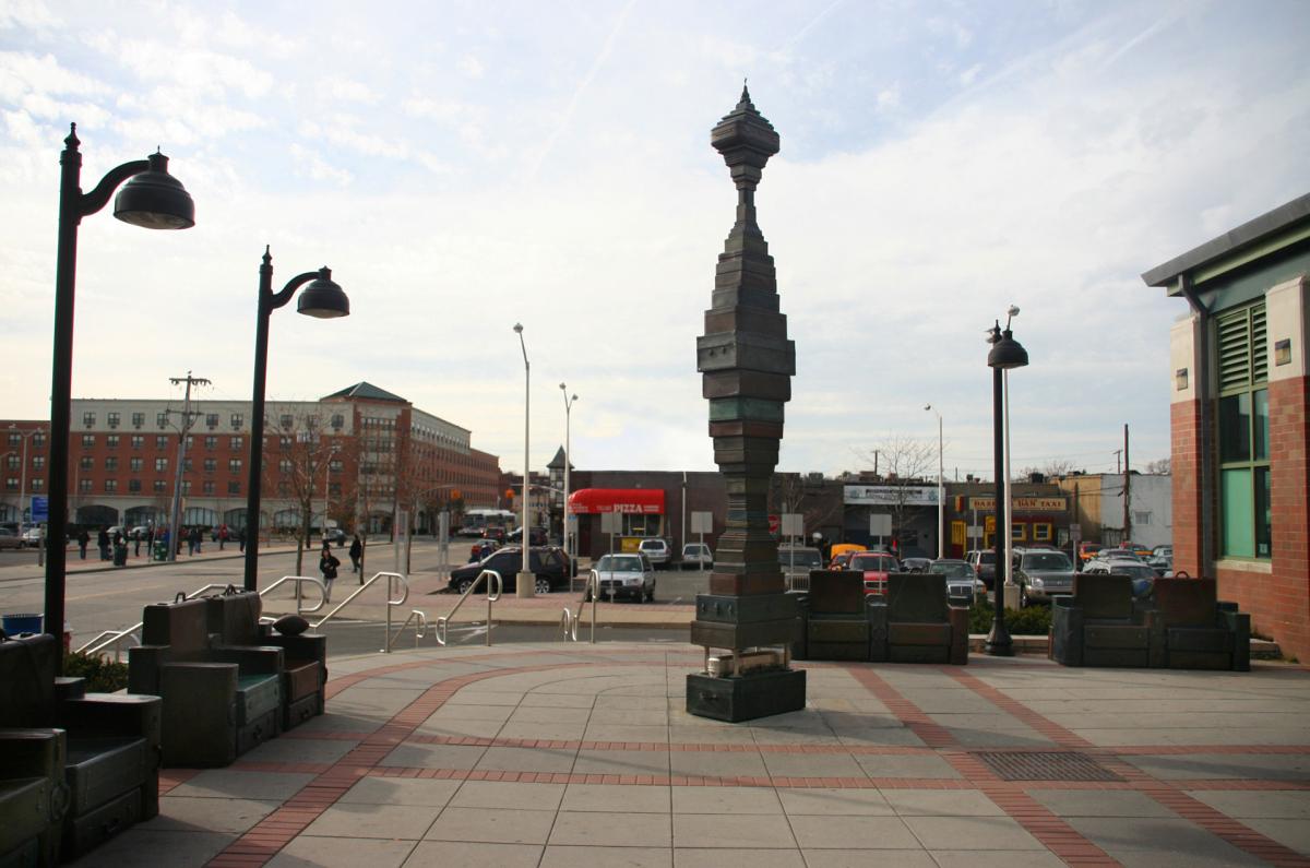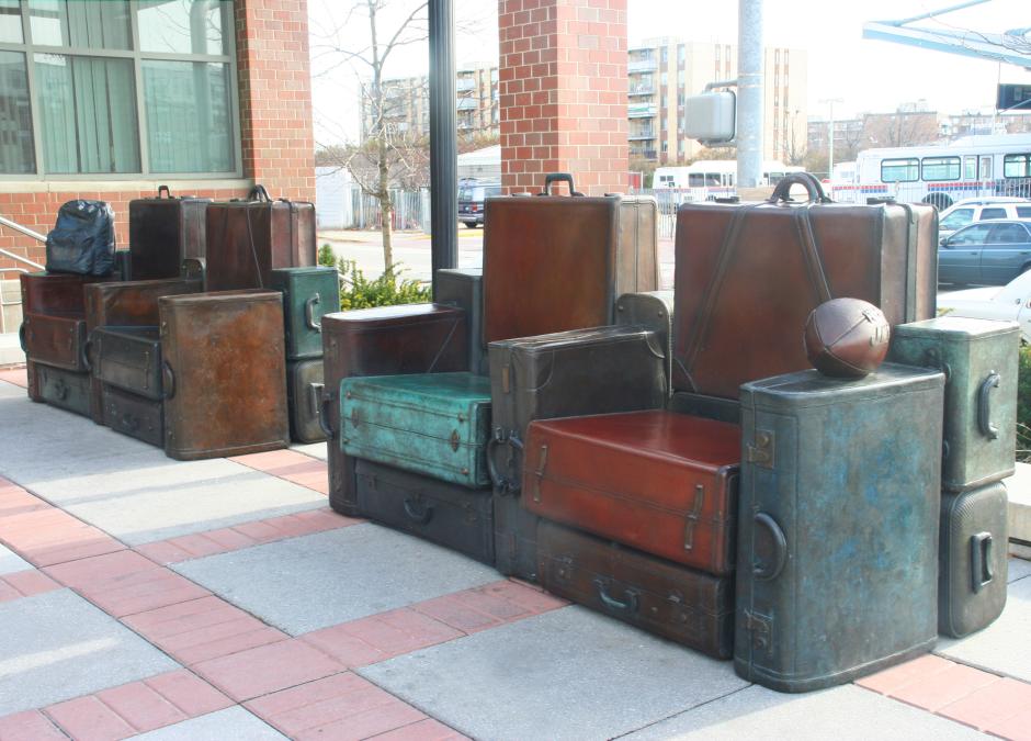 From afar the tower of luggage is puzzling but get closer and you see that the luggage is cast in bronze and colored in a natural patina. The multi-faceted installation includes special cast bronze seating and memorabilia that speaks to the community's heritage and memories. Among the Long Island-related items are an edition of Newsday featuring the Islanders winning the Stanley Cup, an NBA basketball (Julius Erving was from nearby Roosevelt), a Jets football reflecting the team practices at Hofstra University, and yearbooks from Hempstead High School highlighting community events, such as Martin Luther King's address to students from the high school in 1968. Ron Baron refers to himself as a "cultural archaeologist," culling everyday objects from streets and sidewalks, thrift shops, and garage sales. He then forms monumental, "geological" constructs of his finding, which transform the old objects into something completely new.