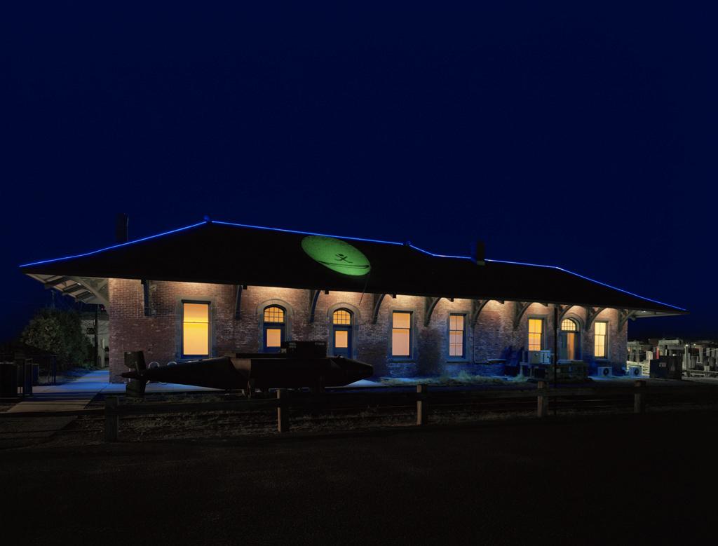 “Illuminated Station” takes us to the past when Greenport and the North Fork of Long Island were home to farmers, fishermen, storekeepers, and railroad workers. Today Greenport is the hub of a growing population of year-round and seasonal residents, an artists' haven and departure point for vacation spots nearby. Anita Thacher creates evocative light-works - art whose effect is created through electrical illumination. At Greenport, she used numerous lighting techniques. The stationhouse's roof is outlined with LED illumination in blue, and the areas surrounding the building are given a deeper blue light. From inside the building comes a yellow glow suggesting candlelight or gaslight. On the station walls and roof, projected light forms images of an indigenous pictograph from the area, emphasizing the importance of the first people to live on Long Island. Through each element of Thacher’s installation the past meets the present and a special place in the community is made more meaningful by the artist.