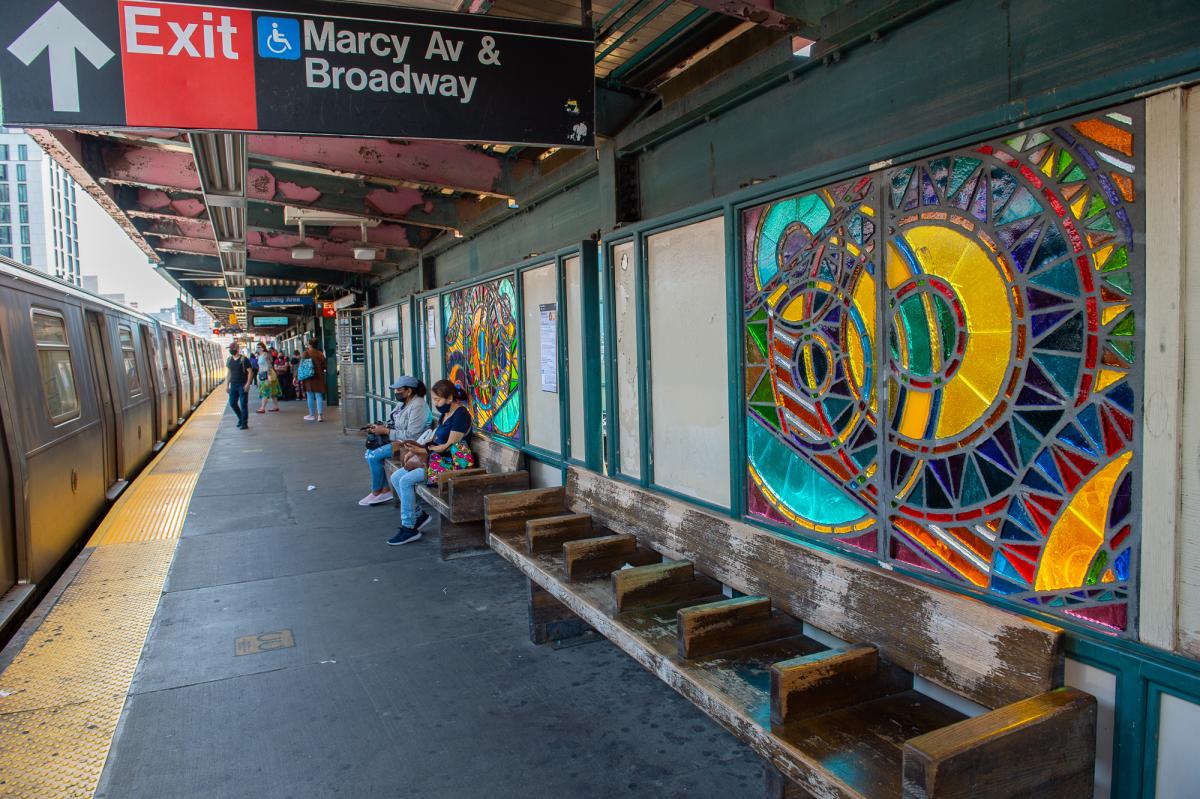 Ellsworth Ausby created eight triptychs for the station's platform windscreens. Their designs explore the relationship of man to the universe. In a subtle way, the brilliantly colored forms evoke the feeling of the swirling cosmos. For this commission, the Ausby produced a series of drawings which were translated into a faceted glass. For this project, Ausby was particularly attracted by "the idea of traveling in infinite space, which is as a passenger on the Earth Express line, experienced through the cycle of the seasons." He was particularly pleased to work with faceted glass windows, "a new and exciting medium for me to work with... These windows have allowed me to expand my understanding of the possibilities that this concept has as public art... It is my hope that these windows express what I feel is the spirit of New York, the hustle and bustle, the fast pace of the city."